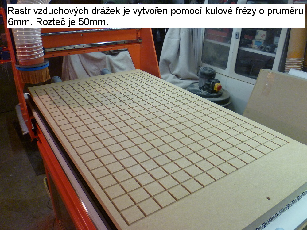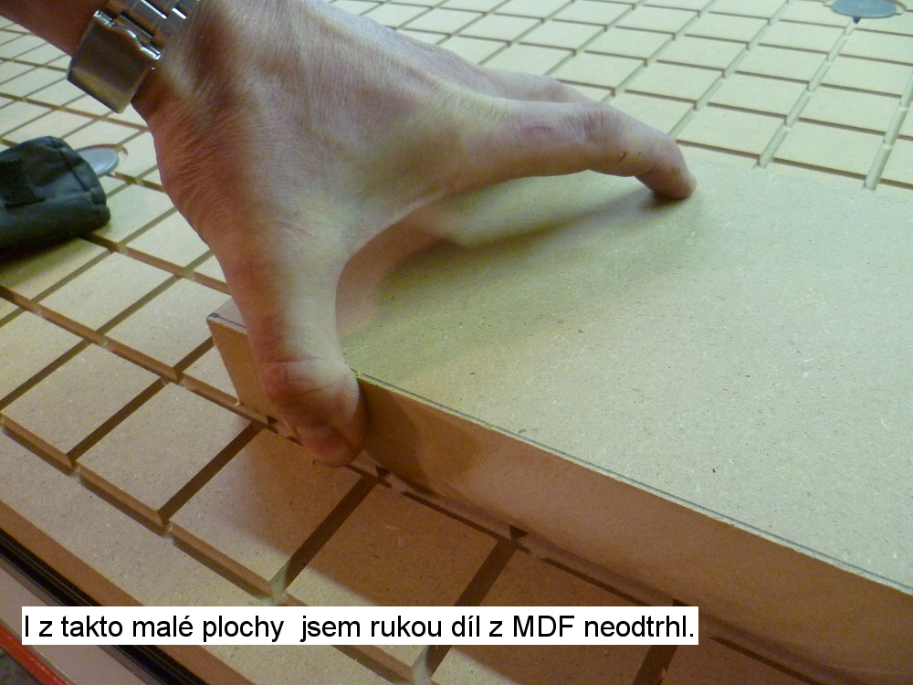 Tak se musím omluvit za mystifikaci. Nezávisle na předešlém příspěvku jsem po propojení dmychadla se stolem provedl zkoušku. Ono to na Depron funguje naprosto spolehlivě i bez těch otvorů. Takže MDF je prodyšná.