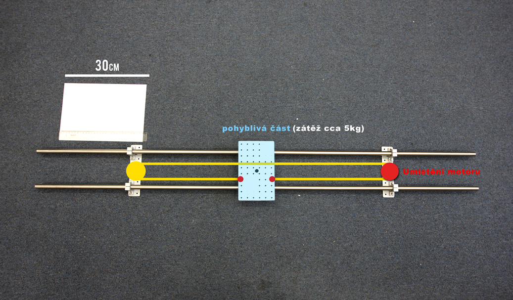 mezi vodícími tyčemi bych napnul lanko a na vozíku by byl bubínek na kterém by bylo lanko 3x omotáno, bubínek by měl oblý "závit" se stoupáním 3mm. Při průměru lanka 2mm a průměru bubínku 30mm vychází na otočku posuv asi 94mm což při šířce bubínku dělá 30 otočení tedy maximální posuv 3m.