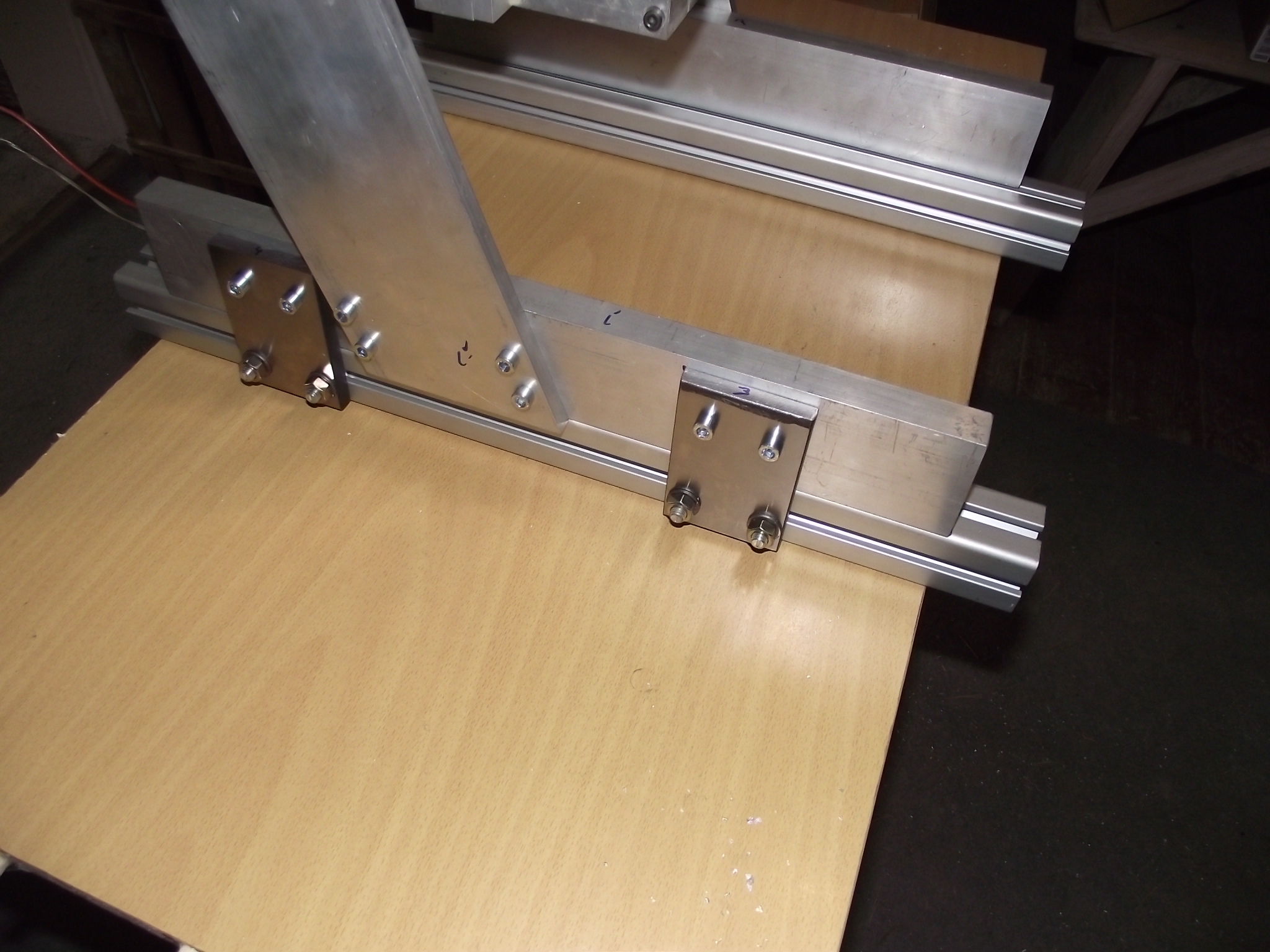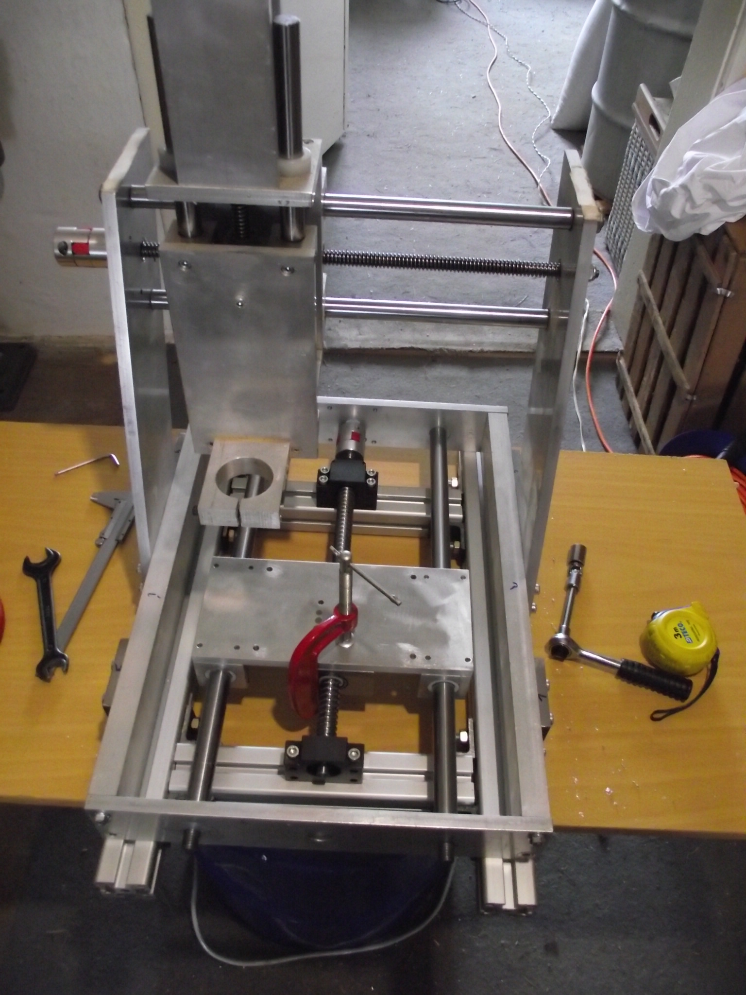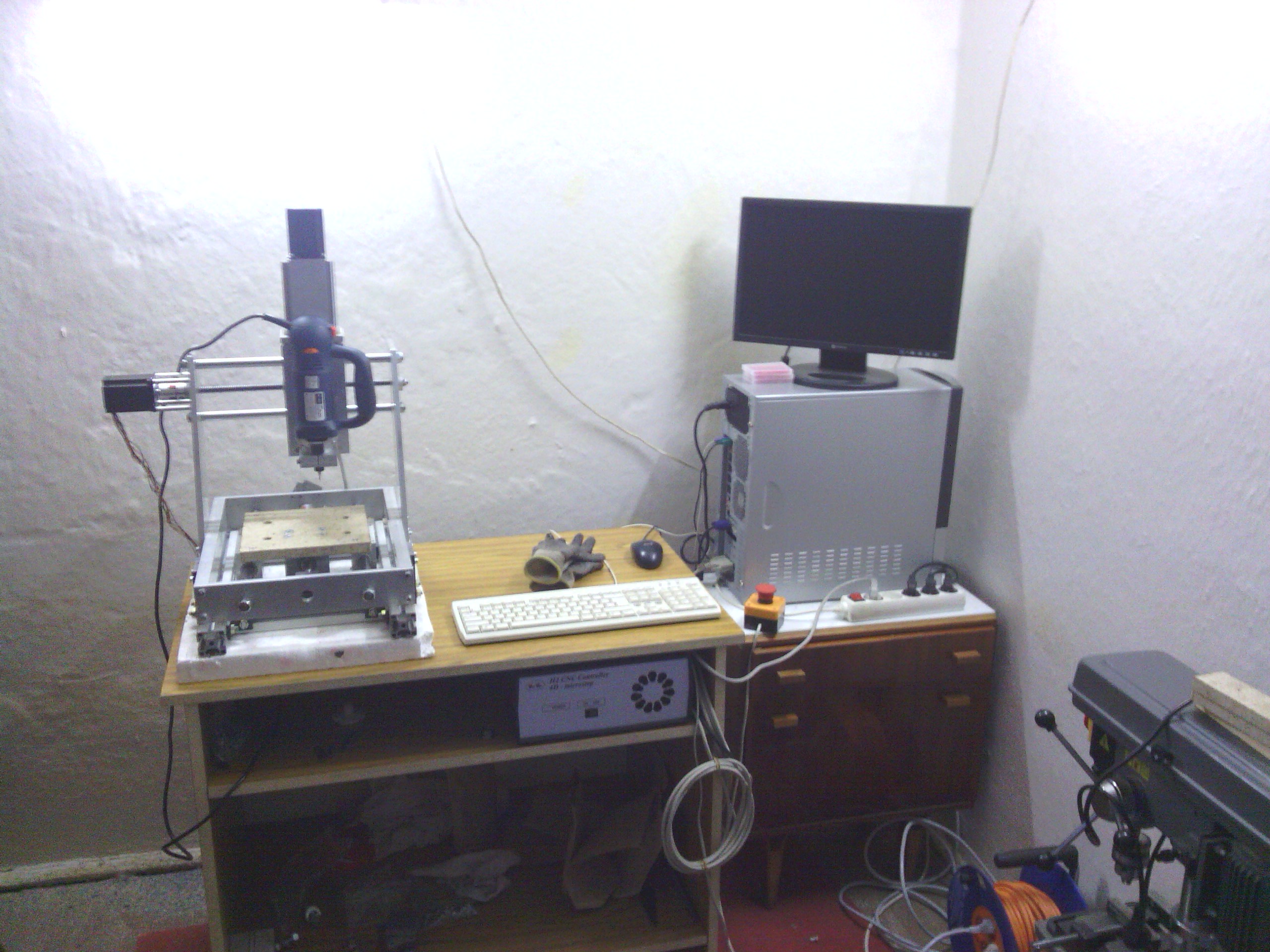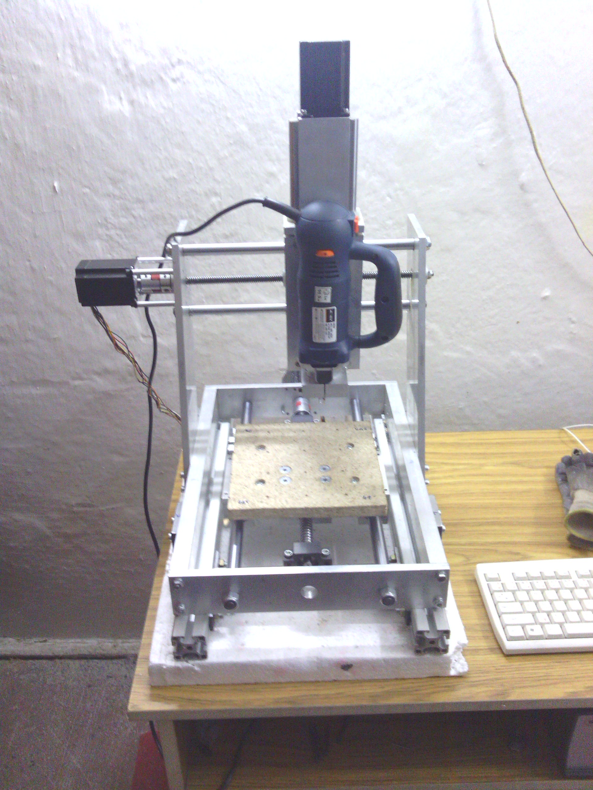 väčšinou fórum len čítam, no teraz som sa rozhodol podeliť o prerábku stroja Kompas H300. Hlavný problém bol prehnutý trapéz na X osi a veľká vôľa v matici čo pri kruhových tvaroch bolo poznať. V zásobe som mal guličkovú skrutku s maticou 16/5 s domkami, Bosh profily a nejaké plocháče. Výmena skrutky mi síce zmenšila obrábaciu plochu z 300mm na 200mm, ale kruh je teraz kruh a nie elipsa. K tomu som ešte na Y osi zdvojil maticu na trapéze. Bosh profily som použil na uchytenie domčekov a za pomoci plocháčov ich prichytil k základu stroja. Ako pracovný stôl je zatiaľ osadená mdf doska - tá sa nahradí hliníkovou doskou 15mm.