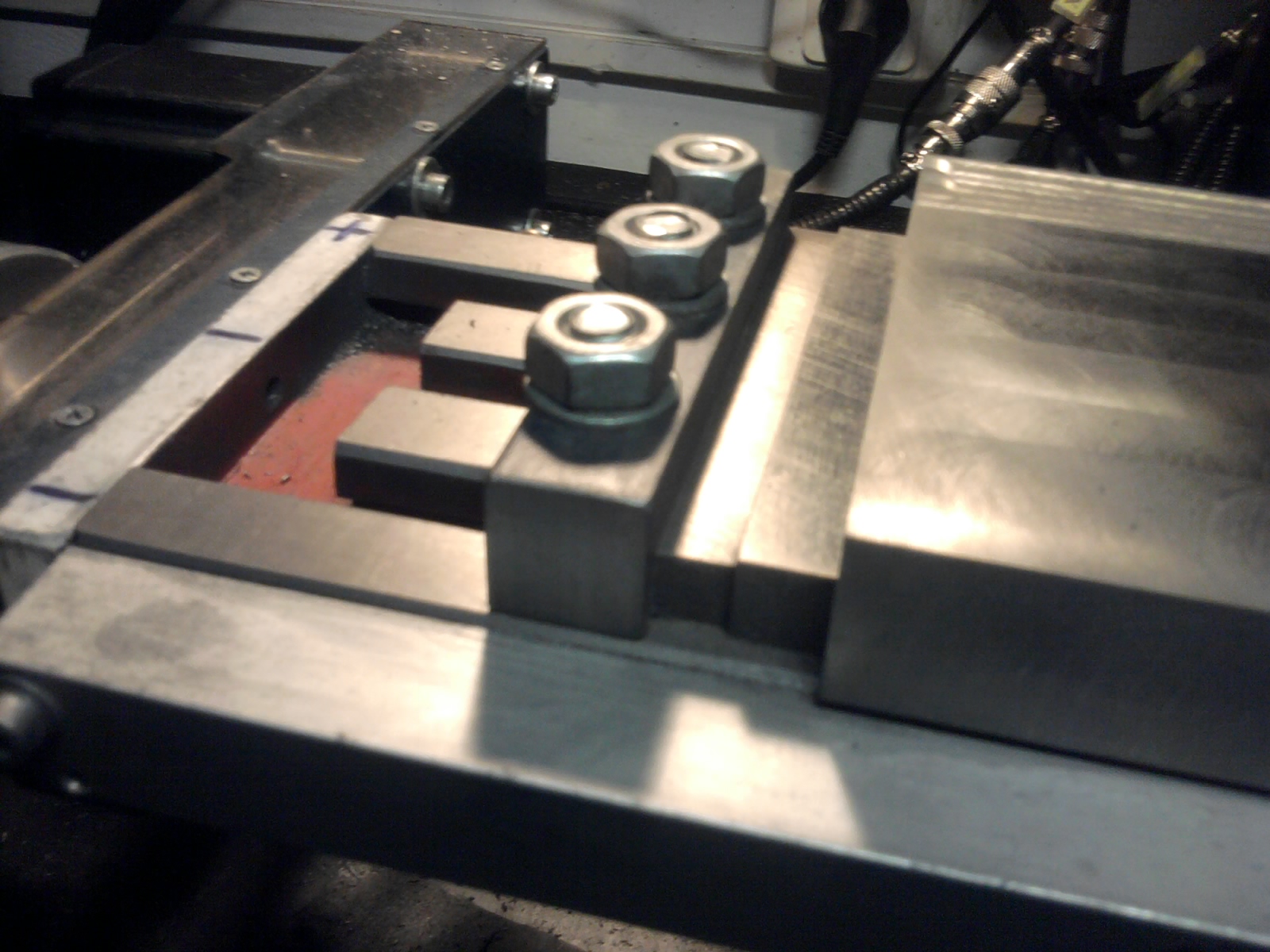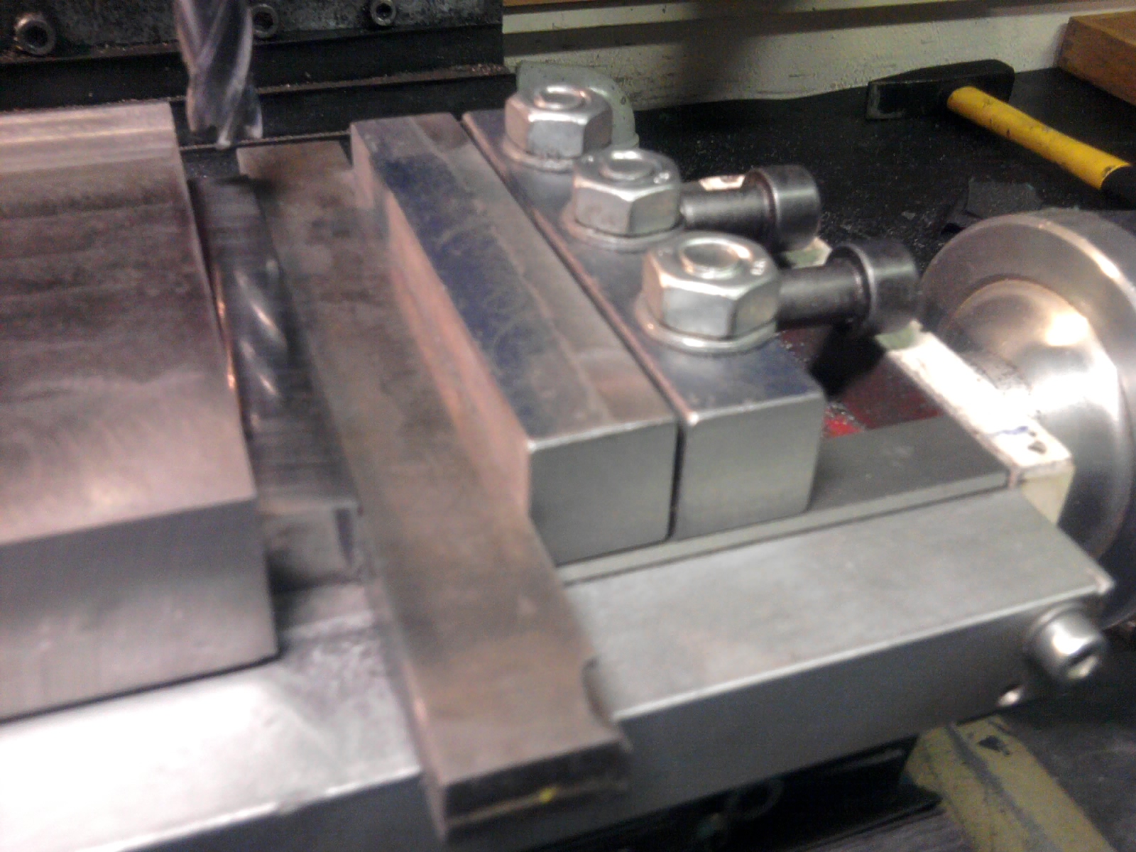 Mám to již delší dobu a vcelku spokojen. Uchyceno ke stolu je to 3x vraťákama M10 z každé strany a vpravo tlačím další hranol imbus.šrouby M10. Tyto šrouby jsou na konci zaoblené aby závit nedělal neplechu. Možná by bylo lepší dát do těch tlačících šroubů kuličky z ložisek, zrovna jsem je neměl po ruce.