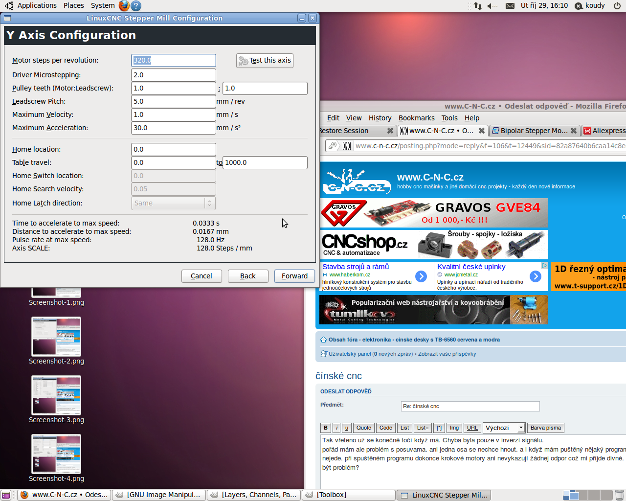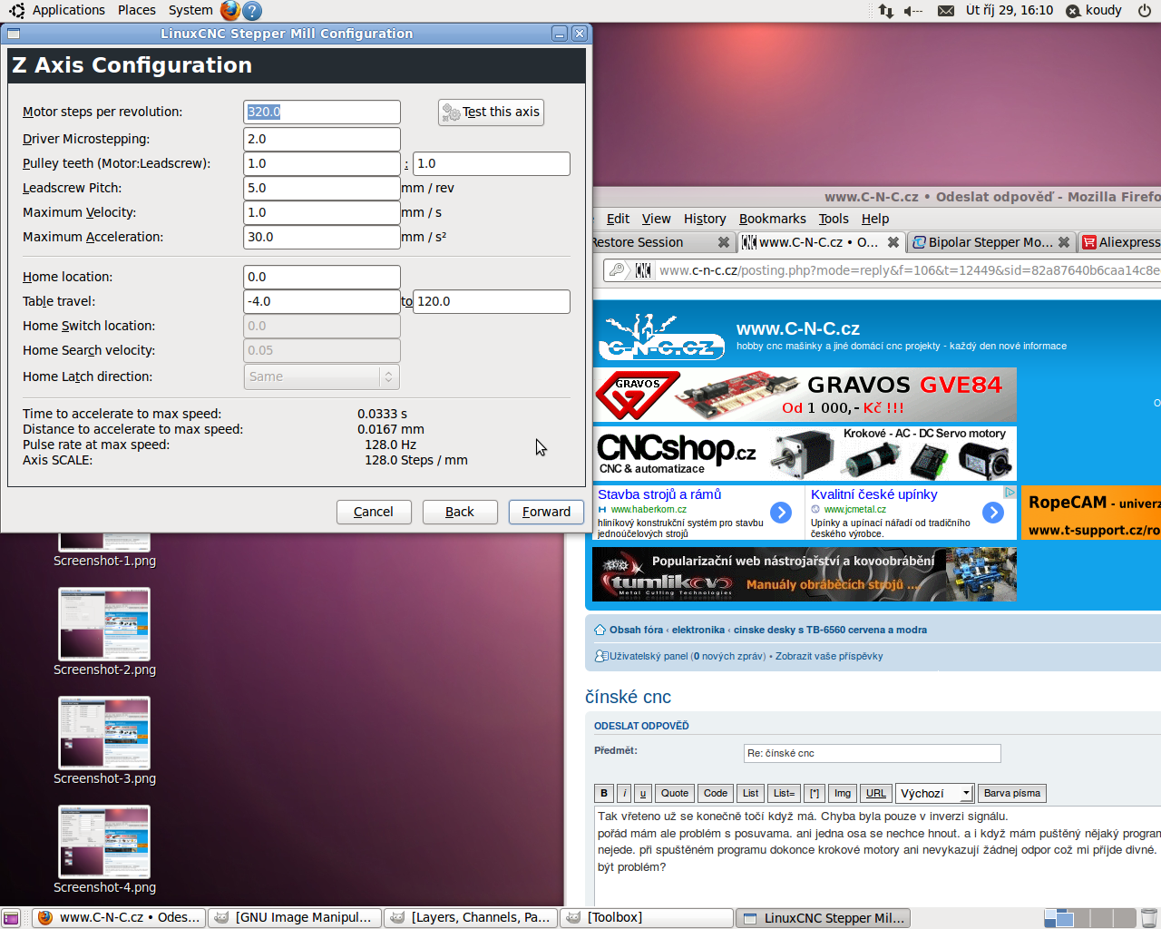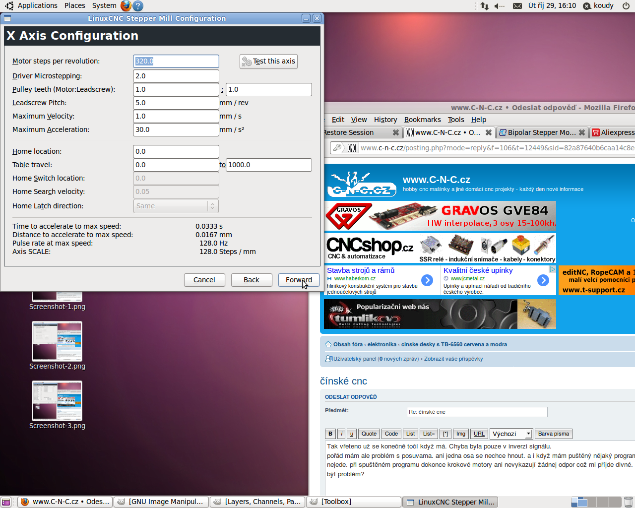 mám problém propojení PC a ovladače ( http://www.aliexpress.com/store/product ... 54901.html" onclick="window.open(this.href);return false;). Toto jsem koupil. Vůbec mi to nejde spárovat ani nijak nastavit. Jestli je tu někdo kdo má podobnou desku a pomohl by mi s nastavení. Požívám Linux CNC na ubuntu 10.04 distribuci staženou z linuxcnc.org.