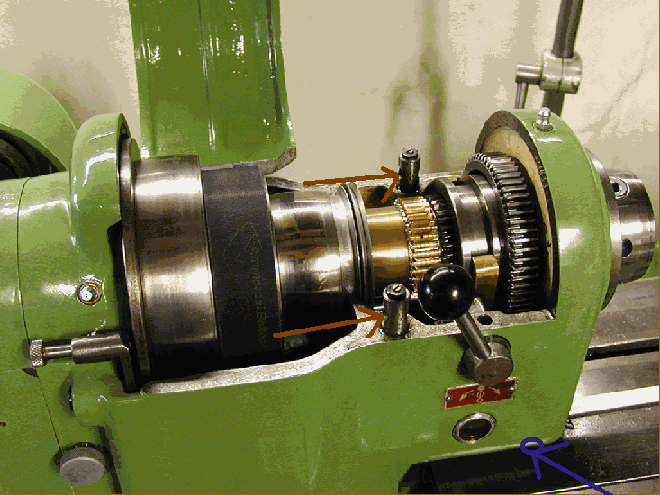 Ahoj tak jsem na toho svího krasavce koukal ( myslím tím soustruh) a vypadá to že bez sundání vřeteníku z lože se pod ten dekl nedostanu , předpokládám že na té fotce co jsi mi sem dal příjdou do těch otvorů které jsem vyznačil nějaké excentry a měly by být přístupné ze směru od řemene jak jsem vyznačil šipkou, jenže tam nic není , mám ze spodu dva púřístupné šrouby , na fotu jsem jeden vyznačil modře , ten samý je i z druhé strany , ale i když je oddělám tak dekl drží a vypadá to že jsou tam další dva šrouby ke kterým se bez demontáže vřeteníku nedostanu :cry: