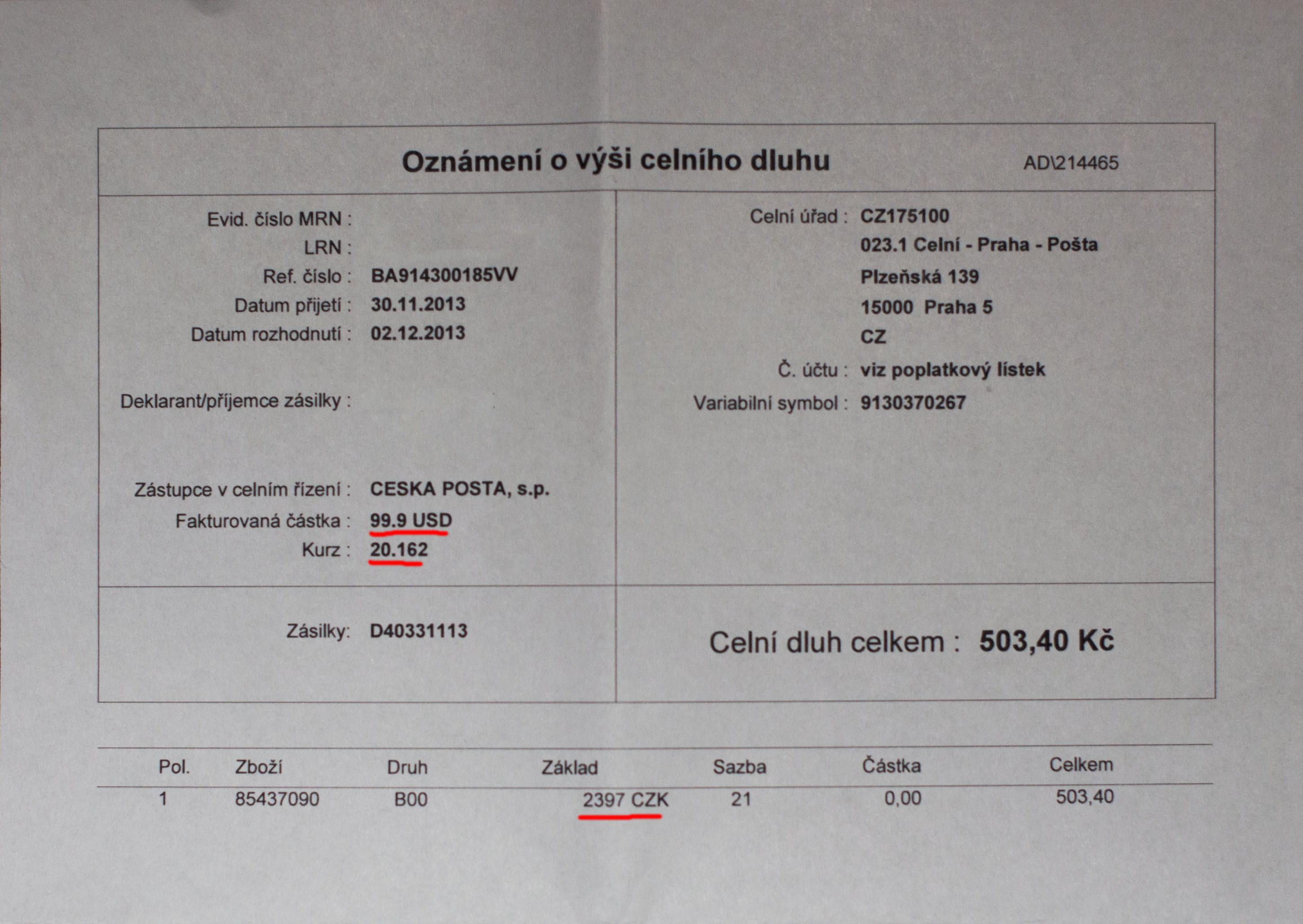 Dnes jsem obdržel zásilku z ciziny, kde bylo vyměřeno clo a DPH. Za zboží jsem platil 99,90$ a 9,99$ poštovné. K zásilce jsem obdržel doklad, který uvádím v příloze. Na dokladu je uveden kurz 20,162. Základ pro DPH (tedy zboží + poštovné) byl určen na 2397 Kč - jenže dle uvedeného kurzu by to měla být částka 2215 Kč. Vypadá to, jakoby částka v Kč pro základ byla určena s kurzem 21,812.