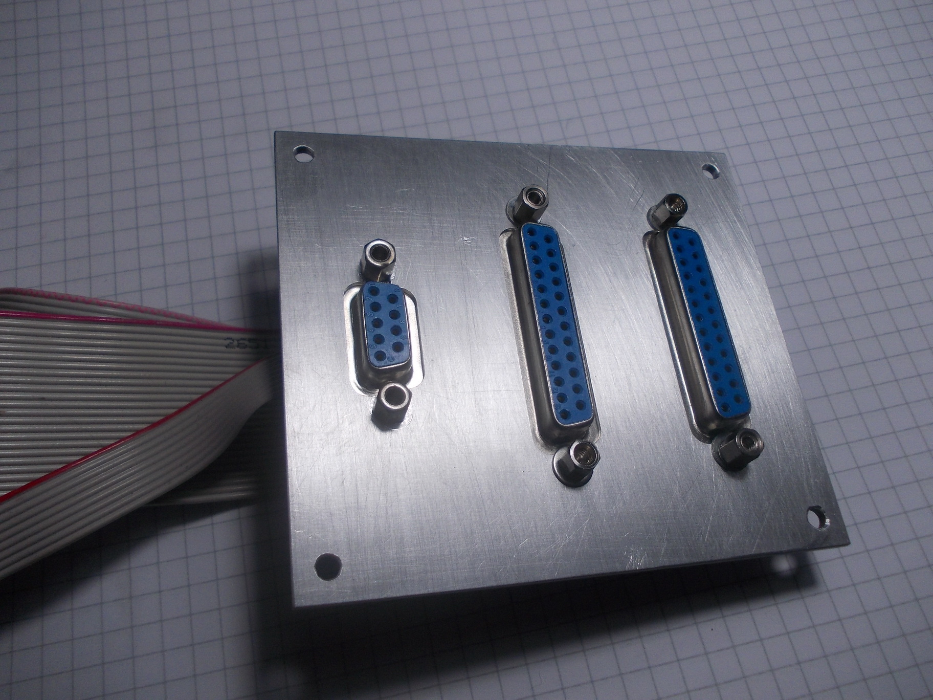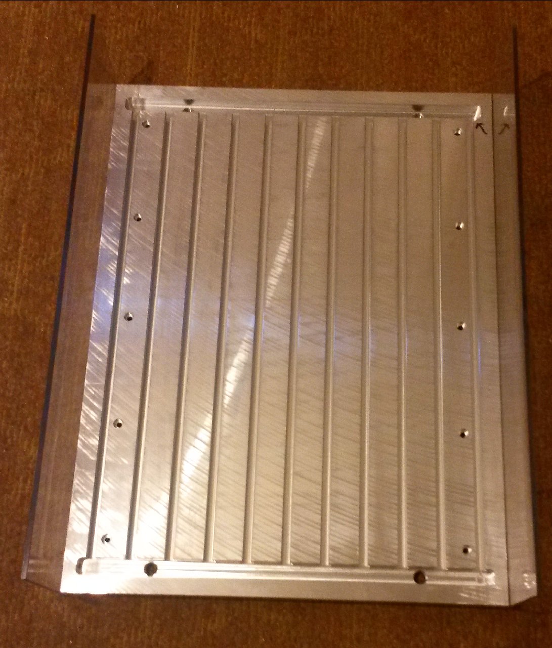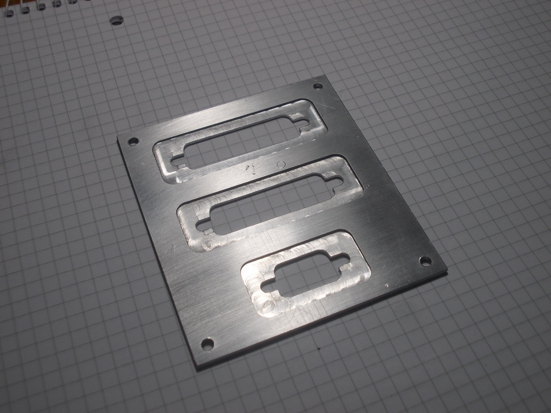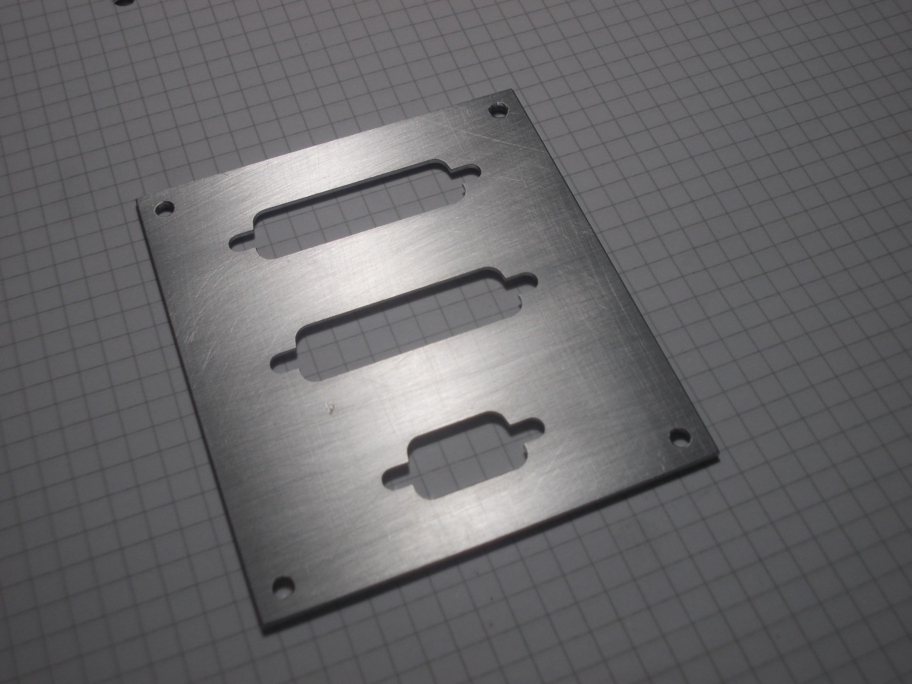 Tak jsem vyrobil panel na LPT a COM konektory, je to z dvojky Al plechu ale hrozná práce musel jsem jet po 0,25mm hloubku protože se to jimak okamžitě lepilo, vypadá to jako elektrykářský hliník nebo co. nicméně výsledek zase tak hroznej není.