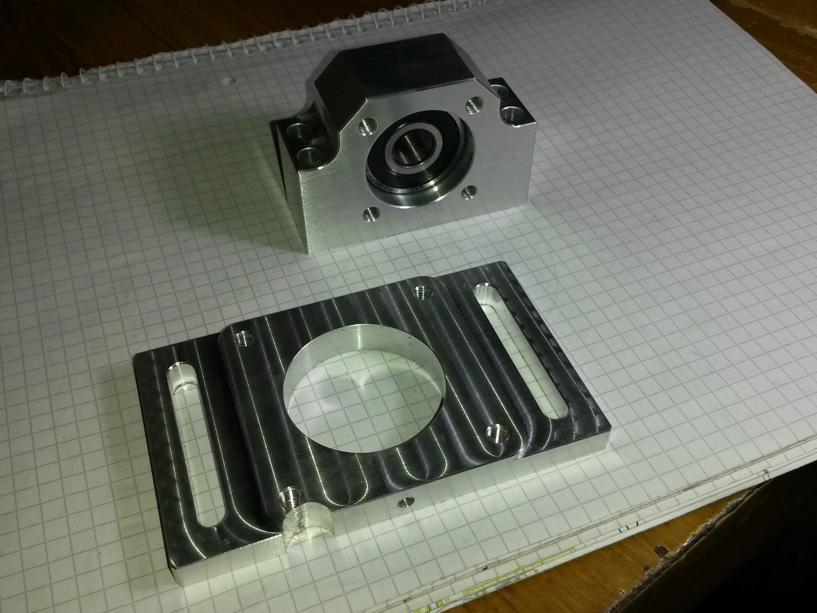 No a co se týče mojí mašiny tak jsem začal dělat první díly z materiálu co jsem tu ještě měl. je to 7075 a dost zvažuji jestli objednat tento nebo 5083 který bude asi o něco levnější. Výhoda v 7075 je samozřejmě jeho vyšší pevnost tvrdost takže se hned tak nepoškrábe a velmi dobře se mi s ním pracije, nevýhodou že nelze eloxovat ale to bych stejně v případě frézky nedělal. V příloze posílám první dva díly, bohužel u té příruby pro krokový motor jsem špatně zadal číslo nástroje a 10ka mi prohučela krz až do stolu, bylo to tak rychlé že neš sem křápnul po červeném kloboučku stop tlačítka tak už byl ve stole 2 mm hluboké kolečko, nicméně celokarbidová čtyřbřitá fréza to přežila bez úhony.