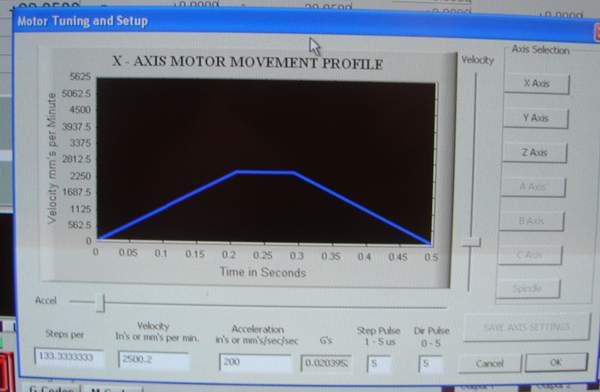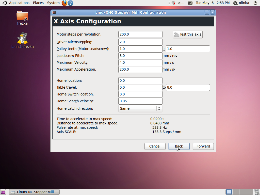 O motorech vím, že mají 200 kroků, testem jsme zjistili, že májí mikrokorkování 2 a šroub stoupání 3 mm, toto jsem zkusil nastavit do emc, a tváří se to, že to mám dobře, nastavím v emc posun o 10 mm, a stroj se posune o 10 mm. Jakmile vsak ve stepcongf, nastavím rychlost větší než 3mm/s dochází ke kvičení, jakoby ty mtoory nestíhali.