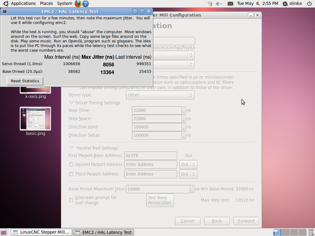 Ahoj, jak jsem tu již psal, koupil jsem starší stroj a pokouším se ho rozjet, zkusili jsme ho spustit na machu, ale jsem zvyklý na emc, tak jsem ho zkusil zprovoznit na emc. Podařilo se nám ho spustit přes LTP port a machem, s nastavením 133,333 krok/mm s rychlostmi viz obrázek z machu cca 40 mm/s. Výrobce udávál rychlost posuvů až 40 mm/s. S machem to bylo obdobné. Poté jsem zkusil nainstalovat linux a emc, zkusil jsem nastavit osy. Podařilo se mi stroj rozchodit, ale jel max. rychlostí tak 3 mm/s. Nejdříve jsem v latency testu měl šílené hodnoty, cca 500 tisíc a víc, tak jsem vyměnil počítač, a podařilo se mi získat cca 15000, tak jsem se těšíl, že stroj konečně pofrčí a ono nic, naprosto stejný.