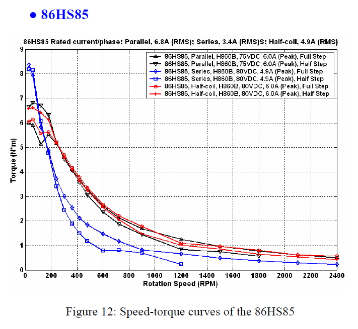 To, že mají jinou křivku u full-stepu a jinou u half-stepu je podle mě tím, že u full-stepu do toho motoru tlačí vyšší proud. Když si uvědomíš průběh proudu u jednotlivých režimů krokáčů, tak u full-stepu jedou vždy obě cívky s plným proudem. Kdežto u jemnějších režimů (počínaje half-stepem) když je proud jednou cívkou maximální, tak je ve druhé cívce nulový. Takže celkový součet absolutních hodnot proudů je u full-stepu vyšší, než u jemnějších režimů.