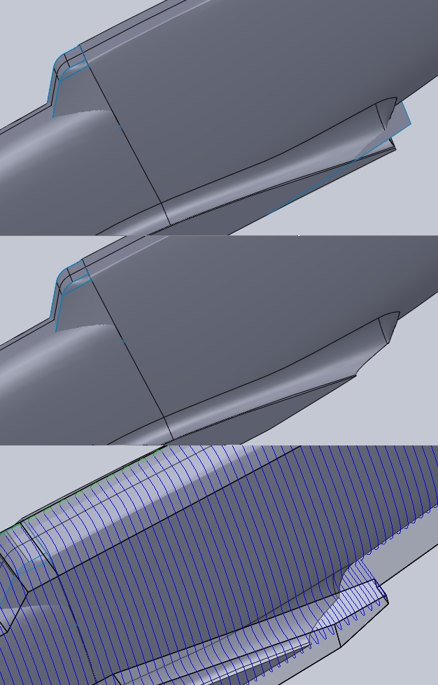 na horní ploše první části polotovaru si opět vytvořím skycu a pomocí nástrojů pro skycu si "obkreslím" s přídavkem to, co přečnívá nad horní plochou. až mám nakreslenu jednu či více uzavřených křivek, tak je opět vytažením "zhmotním". takto postupuji až mám model (trup) celý "v polotovaru". (dá se to dělat i tak, že model rozřežu po vrstvách a u každé vrstvy postupuji tak, jak jsem to popsal u spodní vrstvy)