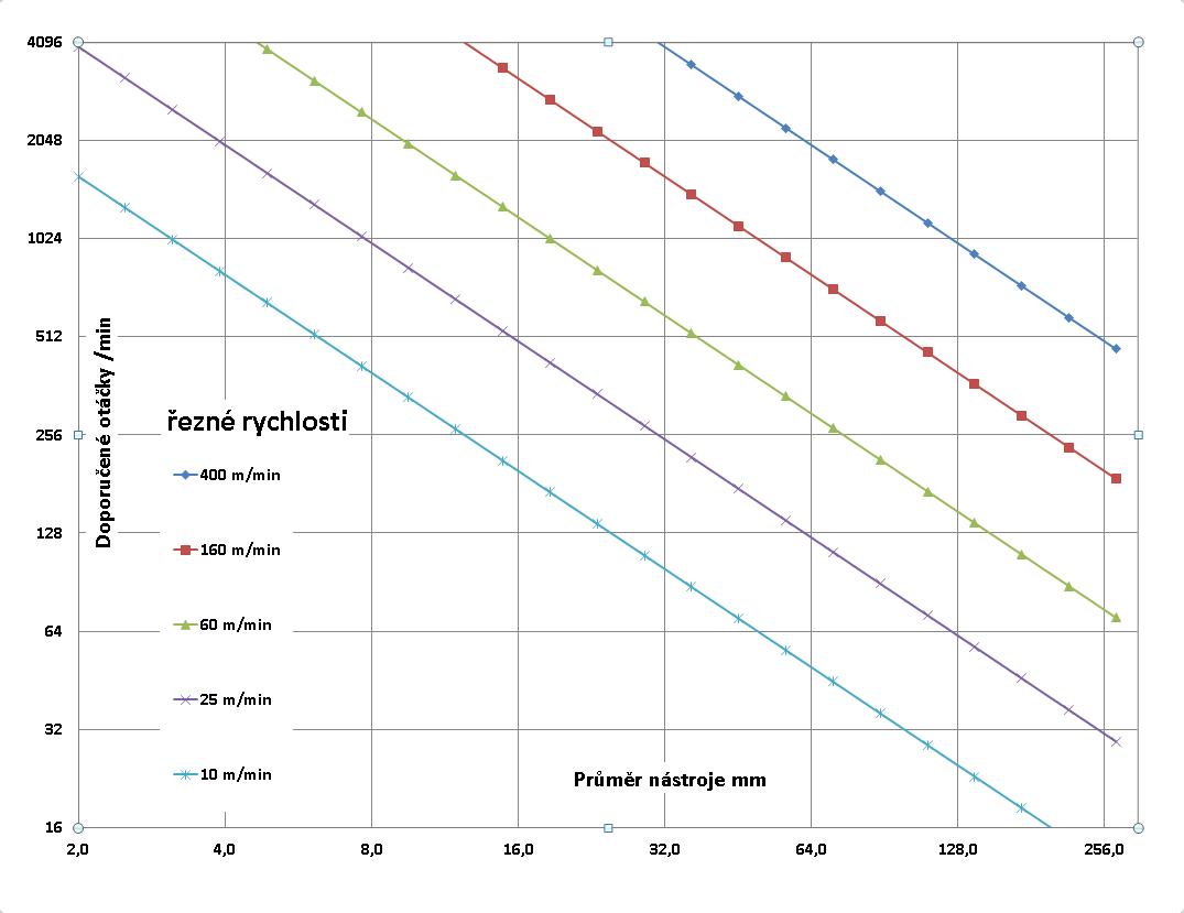 Pak jsem si pohrál a udělal orientační převod průměru nástroje na otáčky pro různé řezné rychlosti.