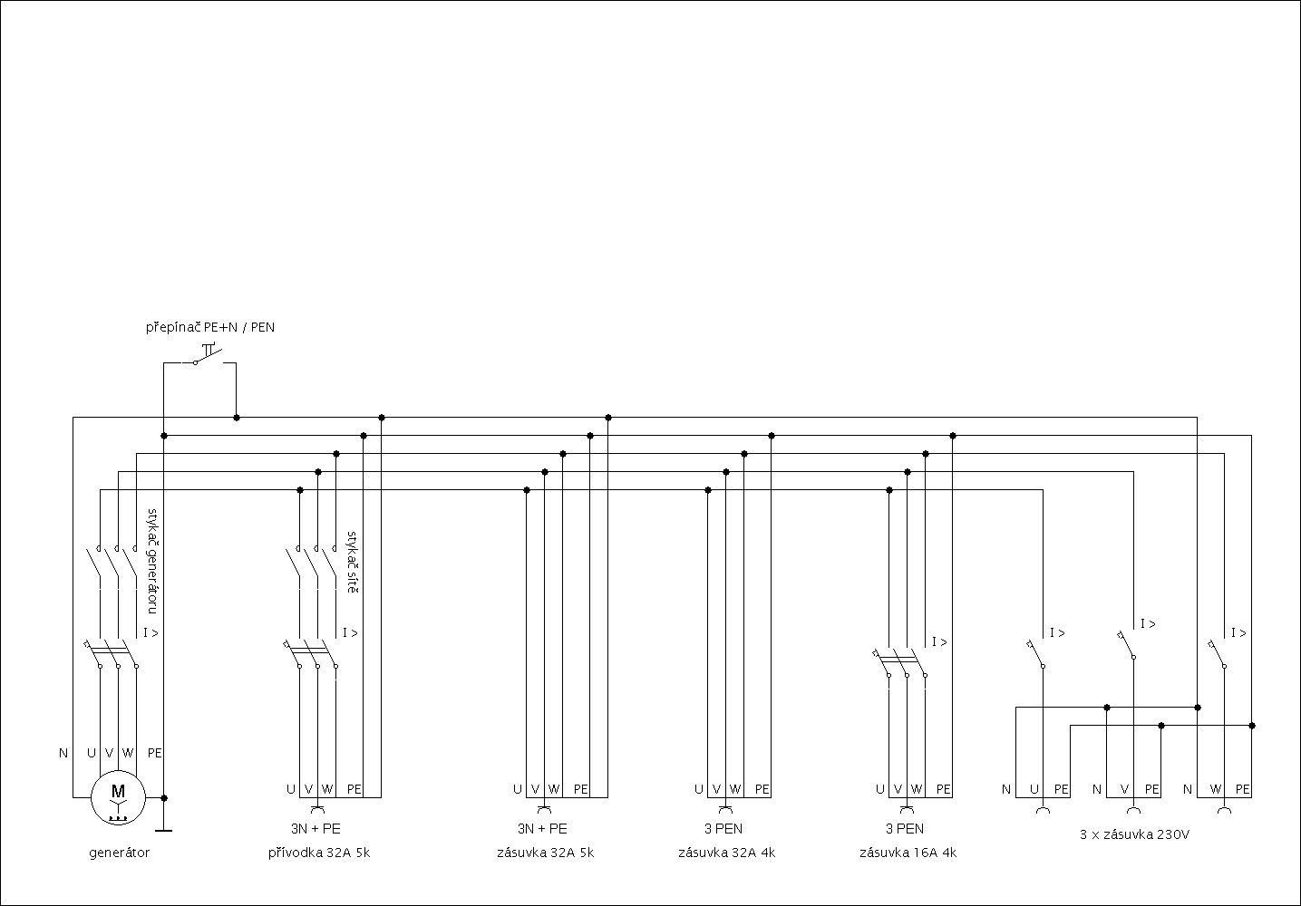 Centrálu vybavím přívodkou 32A 5k, tou bude možné pustit napětí ze síťě do rozvodnice na centrále a dál vývodkou 32A 5k pro připojení zátěže.