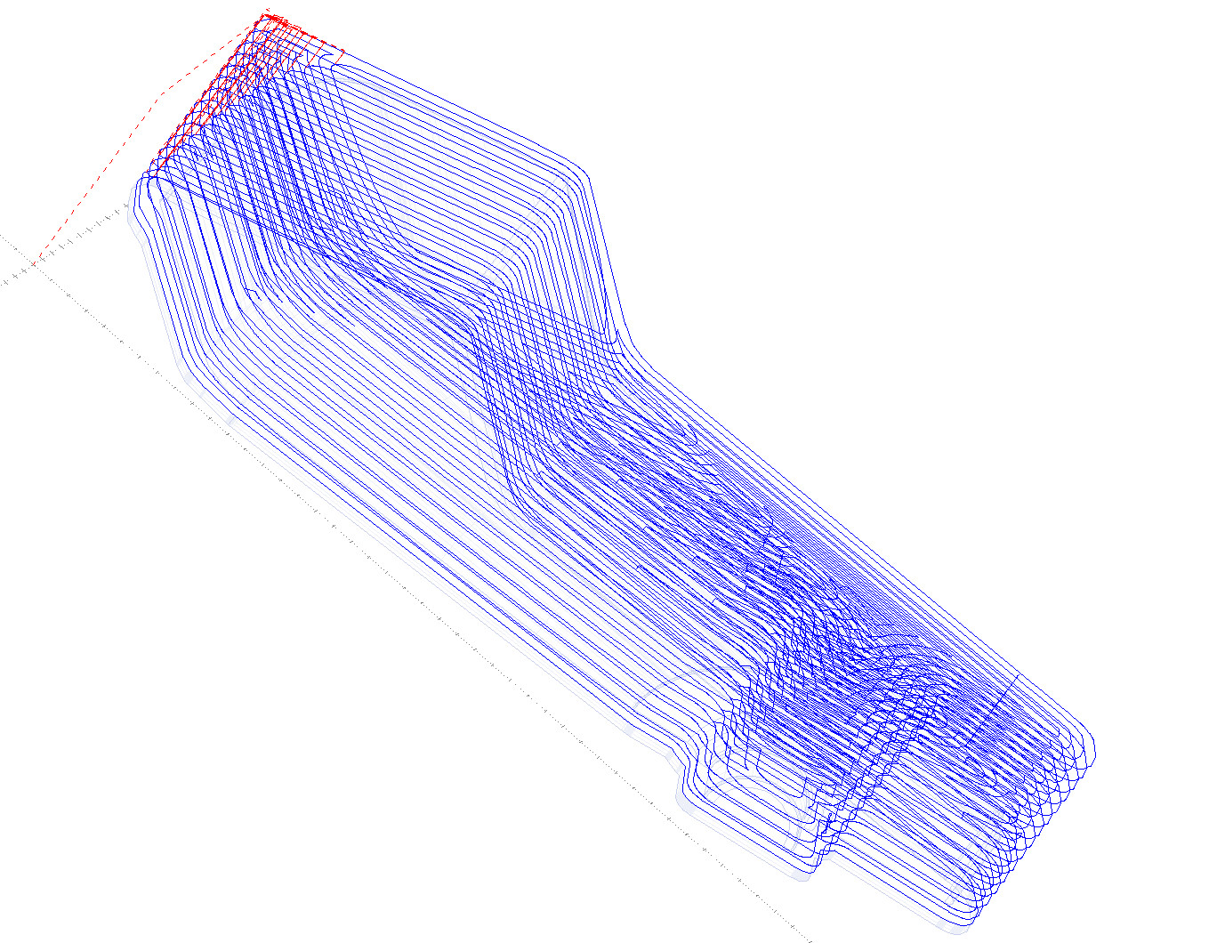 Je tam duplicitně použito omezení rozsahu frézování -- jednak jako Machining boundary, jednak jako Rest machining from job stock. Když se to první vypne, vyjde to podstatně lépe, protože se dráha nebude muset nutně vecpat mezi půdorys polotovaru a model. Dál trochu pomůže zapnutí Order by depth. Ale že by z toho potom vypadla nějaká zázračná dráha, to taky ne.