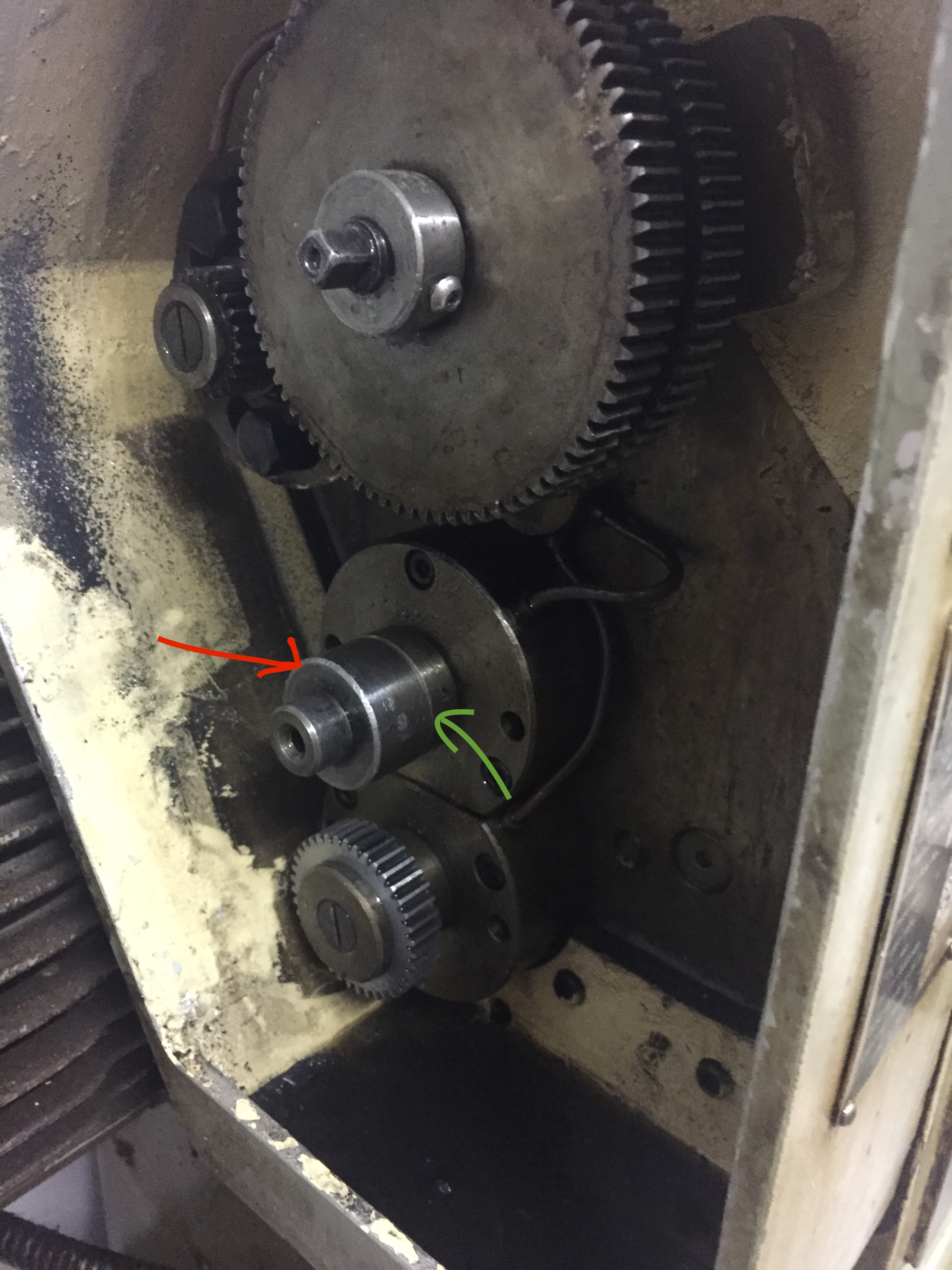 Chlapi, potřeboval bych pomoct. Když chci na mým milovaným soustruhu vyměnit kola pro řezání palcovejch z., musí na jednu hřídel místo jednoho ozub. kola příjít dvě s podložkou mezi nima. Kvůli tomu musím dostat z hřídele distanc (na obrázku červeně), která tam je u těch metrickejch, kde je kolo jen jedno. Za distancí je pevná distanc, v které je nalisovaný kolmo čep (ta je od zelený šipky dál). To, co potřebuju dostat dolů by tam mělo bejt jen nastrčený, po obvodě není žádný červík nebo čep. Je v tom jen perodrážka a v hřídeli pero, což teda na obrázku není teď vidět.