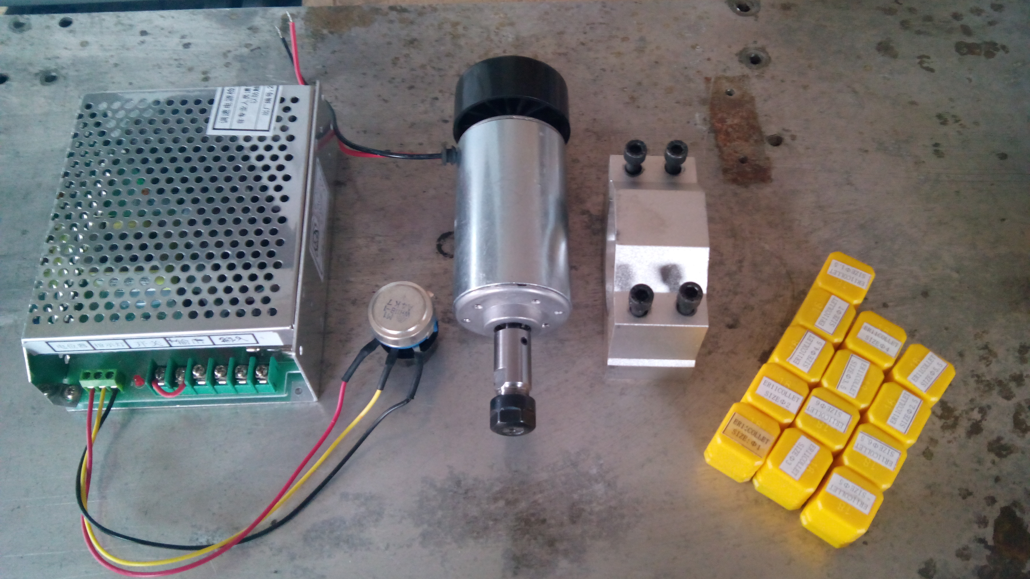 Prodám čínské DC vřeteno 300w se zdrojem s regulací. Běhalo pár hodin na dřevě, pak jsem pořídil silnější. Tohle je takové pižlátko třeba na překližku nebo balzu. Dám k tomu sadu kleštin ER11, ale ty jsou zadarmo jako bonus, některé mají velkou házivost. Originál kleština 3.175 co byla u vřetena je dobrá. Cena 1500kč + poštovný dle dohody.