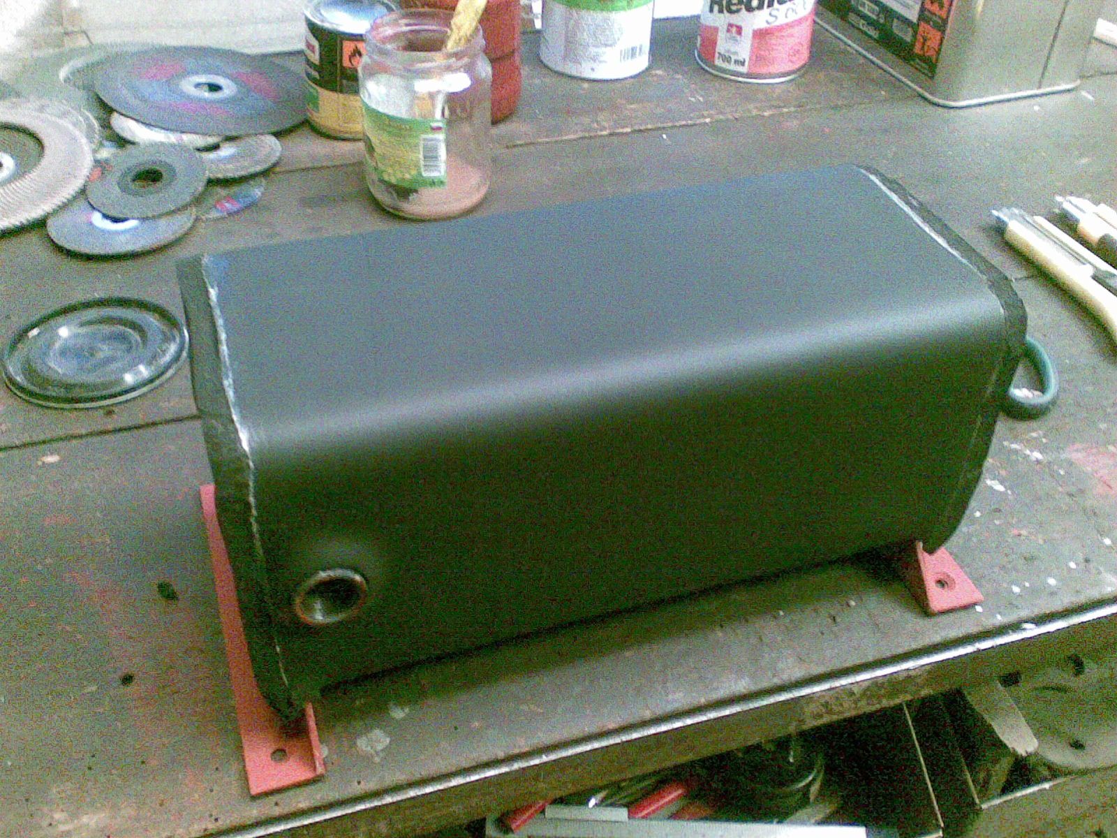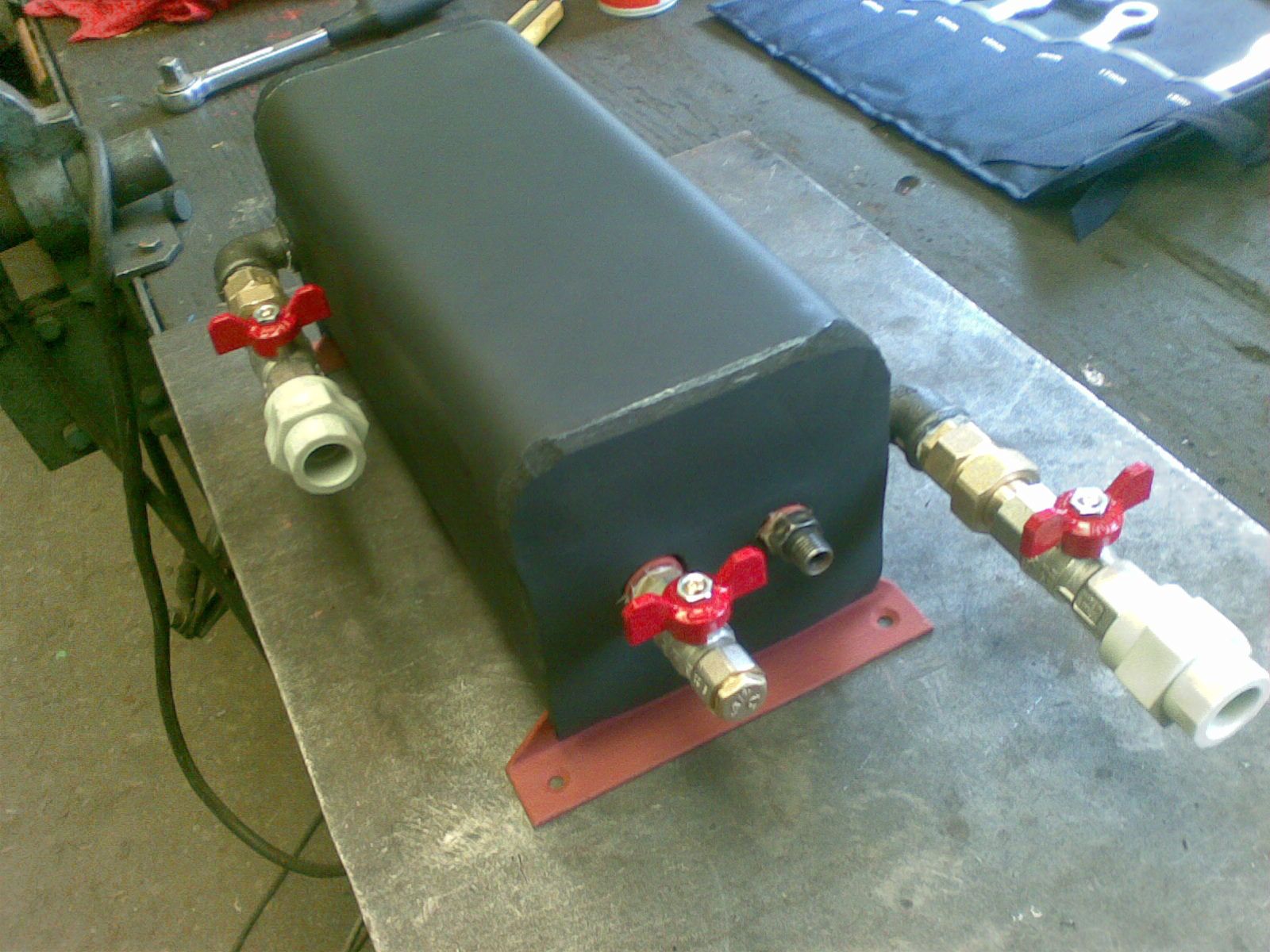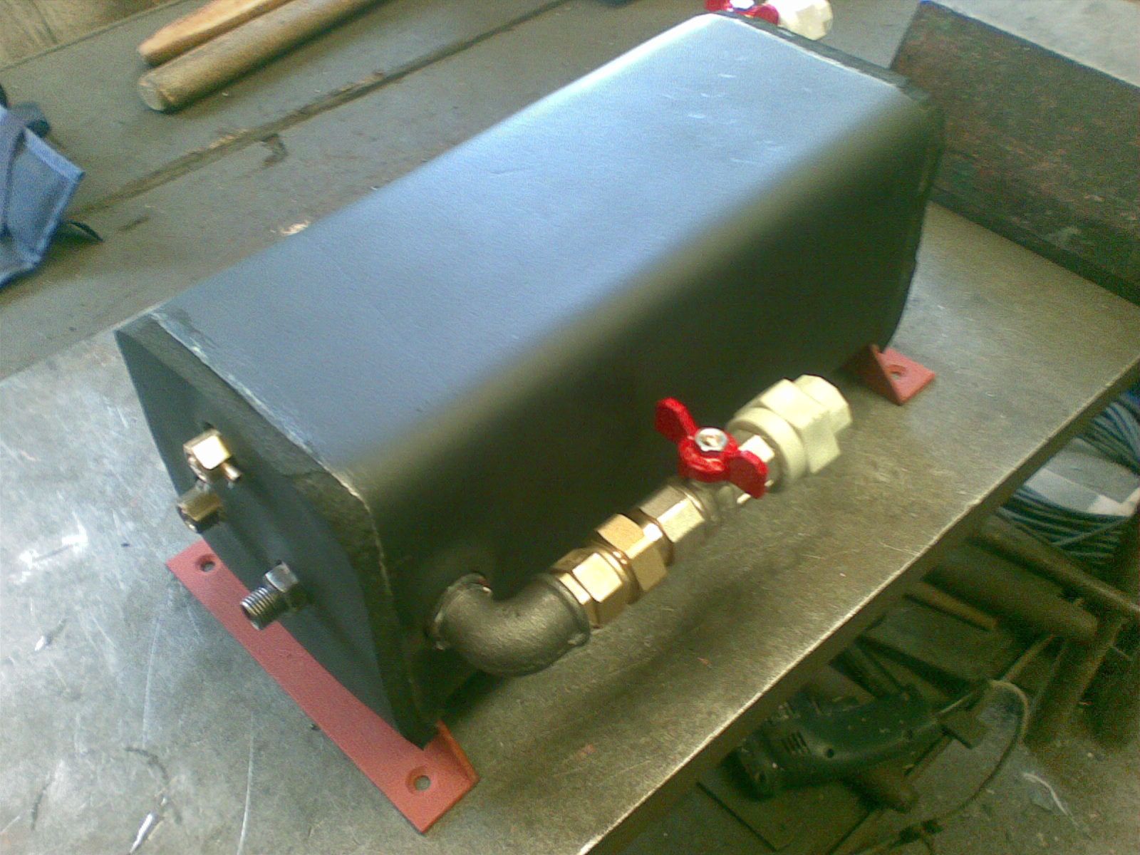 Inovace bez legrace - nač ohřívat olej z 5st. na 120st. elektricky, když ho může z 5st. na 70st. a víc ohřívat kotlová voda. Elektrika ho jen dohřeje ze 70st. na 120st. Jekl v jeklu vnitřní 90x90x3 a vnejší 120x120x3. Dole přívod studeného oleje a odkalovací ventil, nahoře odvod teplého oleje, odvzdušňovák na olej a na vodu. Z boku přívod a odvod topné vody. Připojeno do radiátorového okruhu. Polepeno chlaďařskou kaučukovou izolací 10mm silnou. Objem cca 2,5 litru což musí v pohodě stačit protože jedno čerpání je 0,5 litru a čerpání probíhá v cca 15 minutových intervalech (pokud jede hořák non-stop).