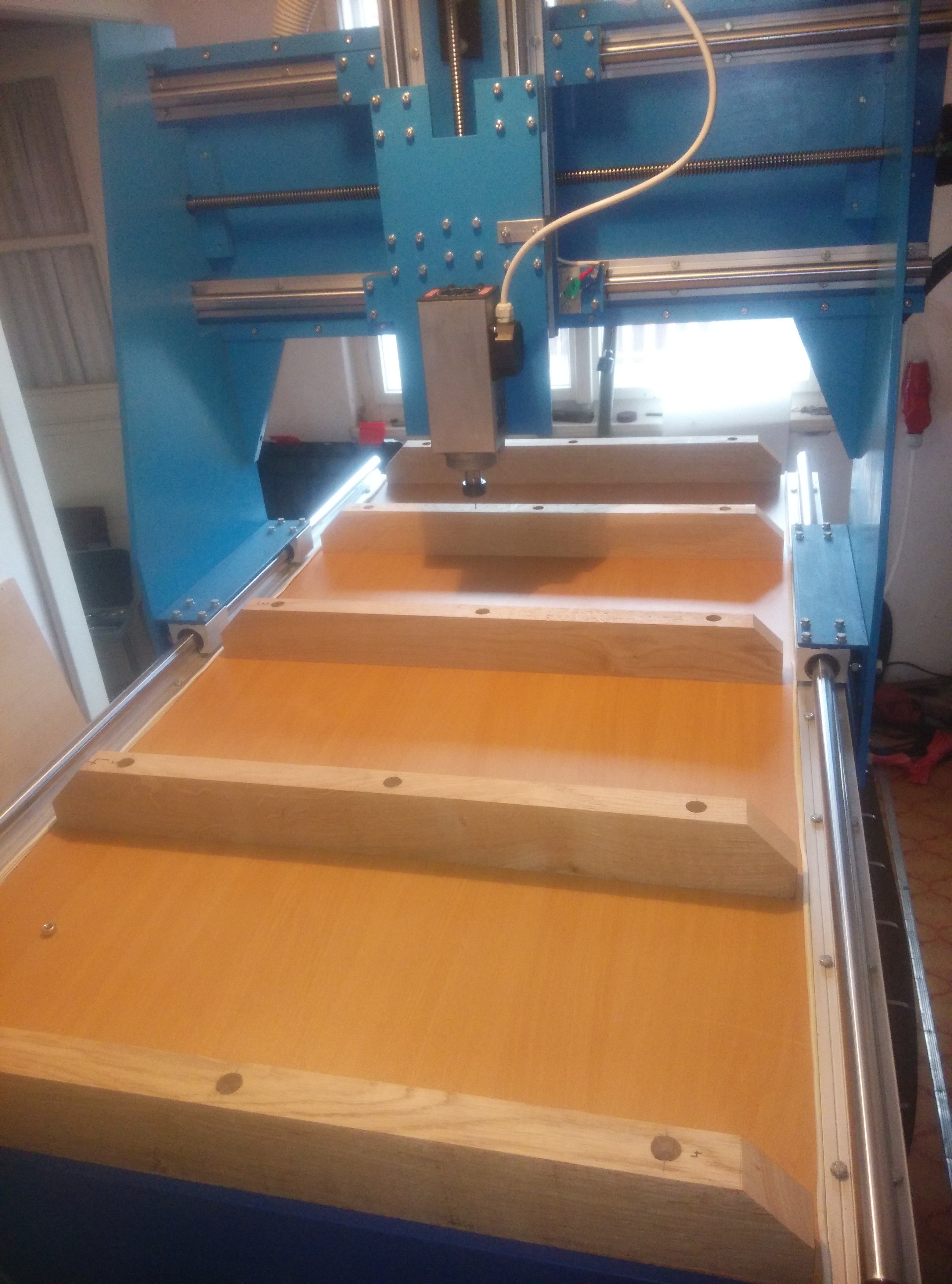 Po dlouhé době opět přidávám nějaké fotky ze stavby. Vše se již blíží ke konci. Právě probíhá zafrézovávání latí a vytváření roviny, na které bude přidělána pracovní MDF deska. Proběhlo také několik úprav na ose z, např. byl vyměněn trapézový šroub za kuličkový. S trapézovým to chodilo naprosto otřesně(nešlo se dostat na vyšší rychlost). Také budou dodělány výztuhy na osu Z.