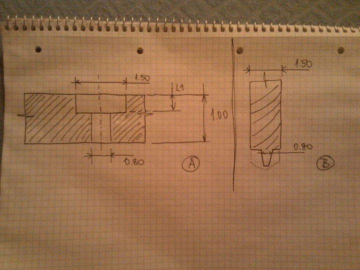 V materiále mosadz (obr. A) mám predvrtanú dieru na závit M1, s hornou kapsou L1 = 0.3 mm. Potrebujem ju prehĺbiť, vždy podľa potreby, na 0.4 - 0.5 mm.