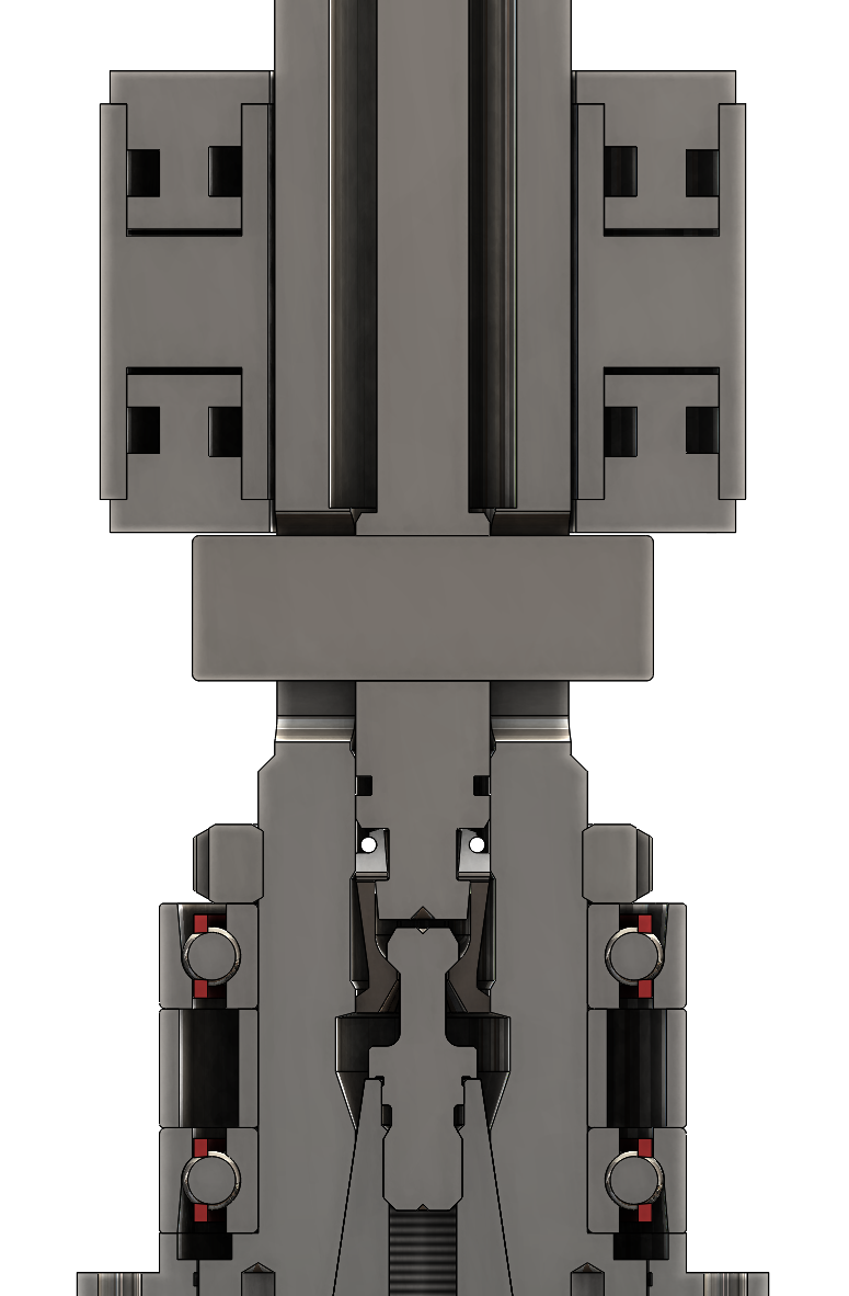 Horní píst by vyjel o 1-2mm nahoru a zapřel se o hřídel, tím pádem by nešla síla přes ložiska a spodní píst by následně hydraulickým tlakem začal směrem dolů (3-6mm) stlačovat pružinu a tím uvolnil nástroj.