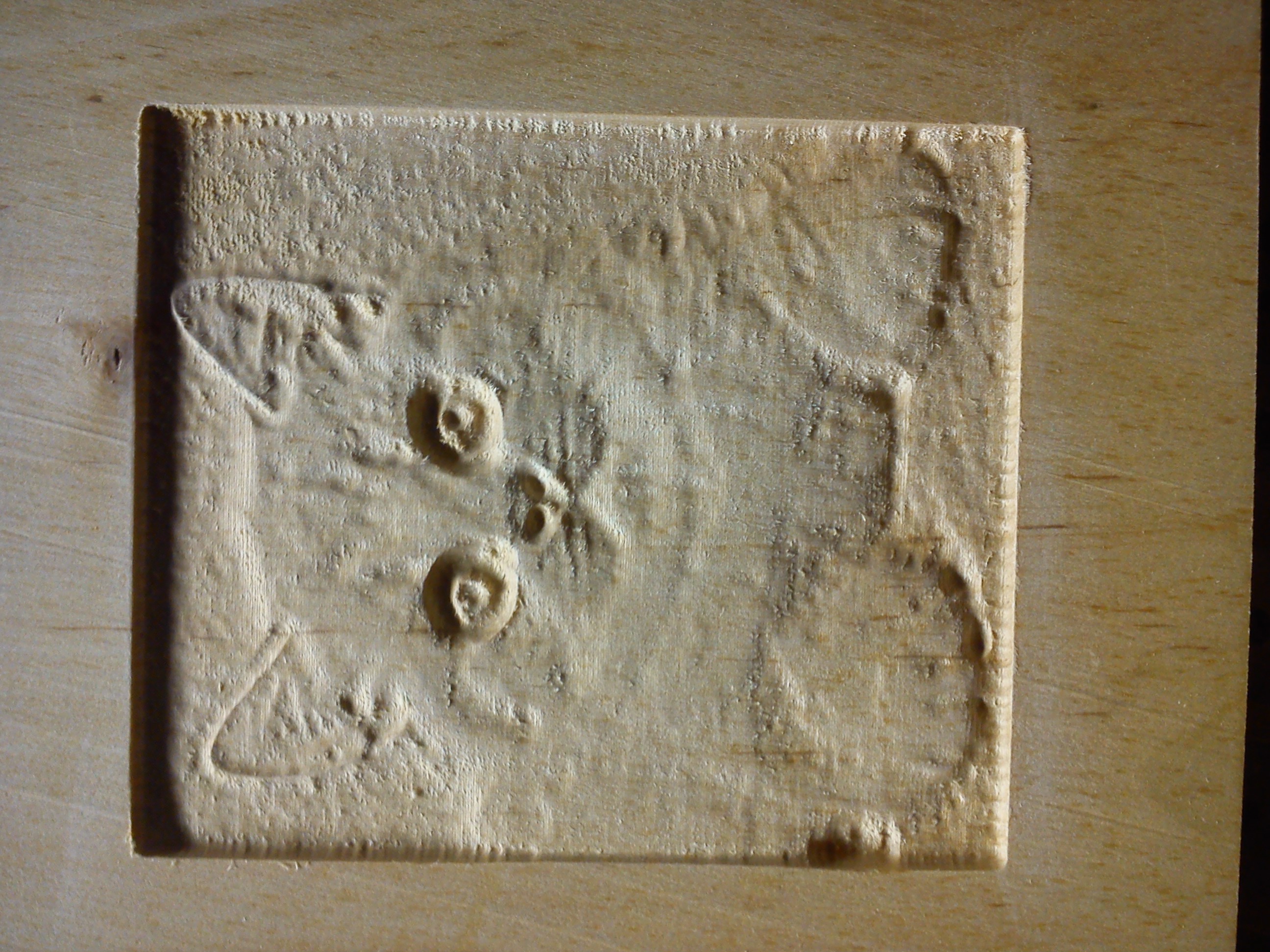 35 je uhel drahy nastroje (freza jede sikmo), ten uhel je takovy "sedmy schod" chce to zkouset, hloubka je dana kontrastem, cim hloubeji, tim bude dane misto svetlesi a obracene, u fotky cos daval je to neco jinyho, lepsiho vysledku dosahnes odbarvenim a invertovanim fotky, v artcam, aspire.. se to pak jeste da "vyhladit"melirx píše:tech 35 stupnu je mysleno,ze naklonis material treba ve svraku nebo nejakym klinkem pod tim uhlem?Ye na zacatku fotky ti to bere treba jen par desetin a na konci uz treba 3mm do hloubky?