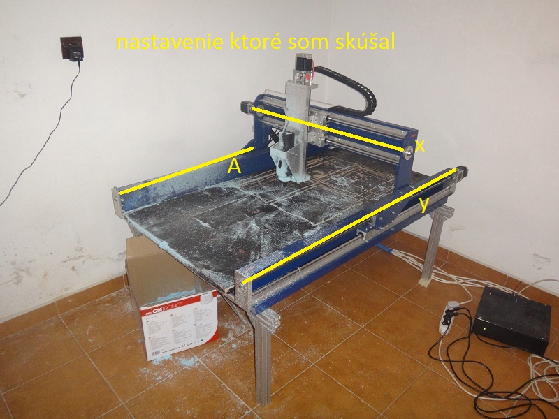 Tak idem sa snažiť to popísať čo najlepšie ako budem vedieť.Odchýlka sa deje na mojej osi Y. Áno viem že väčšinou os Y má dva motory a X jeden motor ale ja som kúpil stroj kde to bolo a je nastavené tak že os X má dva motory a os Y má jeden motor. Proste nastavenie bolo dané už od výrobcu. Prikladám obrázok aby to bolo jasné. Čo sa týka tých prehodených osí tak moje pokusy: Frézovanie 9 tich kruhov : posuv 1000,rampa 600,pulzy 8 - odchýlka na normálnom nastavení 1 mm.