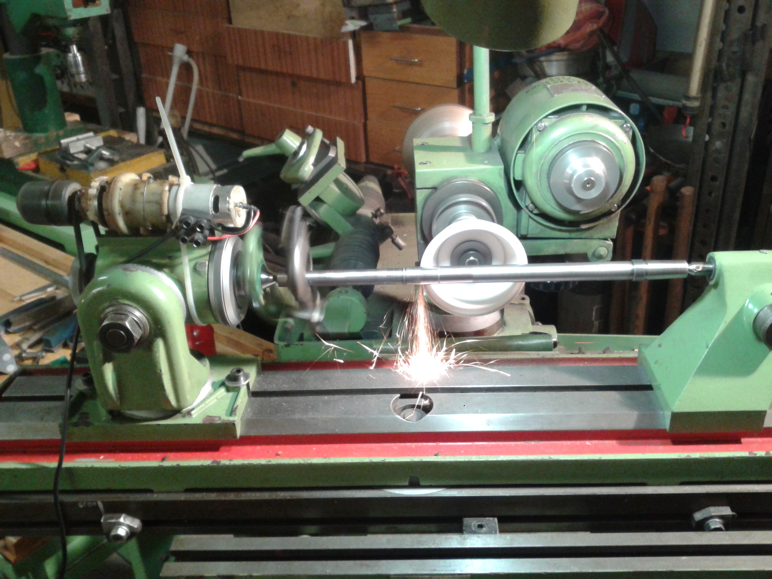 To se ti jenom zdá, to čelo hřídele i když tam je Mk2 je delší "pouze" o 3mm oproti původnímu kuželu. Jinak tahle předělaná na kužel Mk2 má výhodu v tom, že tam můžeš upínat i vrtáky s Mk 2, případně redukované Mk1, což je asi největší výhoda, mimo to tam prostě narazíš jakou chceš hlavičku. Já jsem tam měl původně motor se 750 otáčkama do pomala, ale protože tady mám 4 ty vrtačky tak jsem tuhle nakonec předělal na motor s 2800 otáčkama, takže na tom nejvyšším stupni to točí cca 5600, a vrtám tam s malýma vrtákamafidel47 píše:Já jsem tam udělal rovnou Mk2tumlik píše:fidel47 píše:....... tak jsem se pokusil mezi hroty na jedno upnutí udělat na soustruhu vřeteno nové