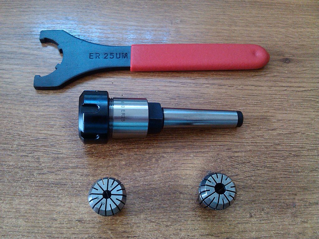 Se záhlubníkem sem vzal na kovonástrojích ještě kleštinový úpínač ER25 / mk2 (mají ho za nejlepší cenu co sem našel) a pár kleštinek. Bral sem ho hlavně kvůli zlepšení výhledu na obráběné místo. Při použití krátkých fréz, které mám doma a klešitn pro přímý upnutí je to totiž celý utopený pod hranou frézovací hlavy a na obráběný místo není pořádně vidět pokud se víc neskloním.