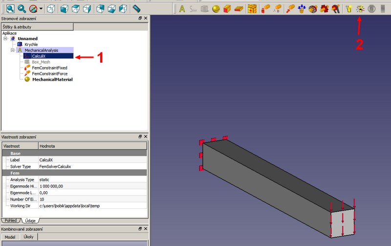 Přepneme se do modulu FEM. 1 - ve stromě označíme díl. 2 - klikneme na ikonu A.