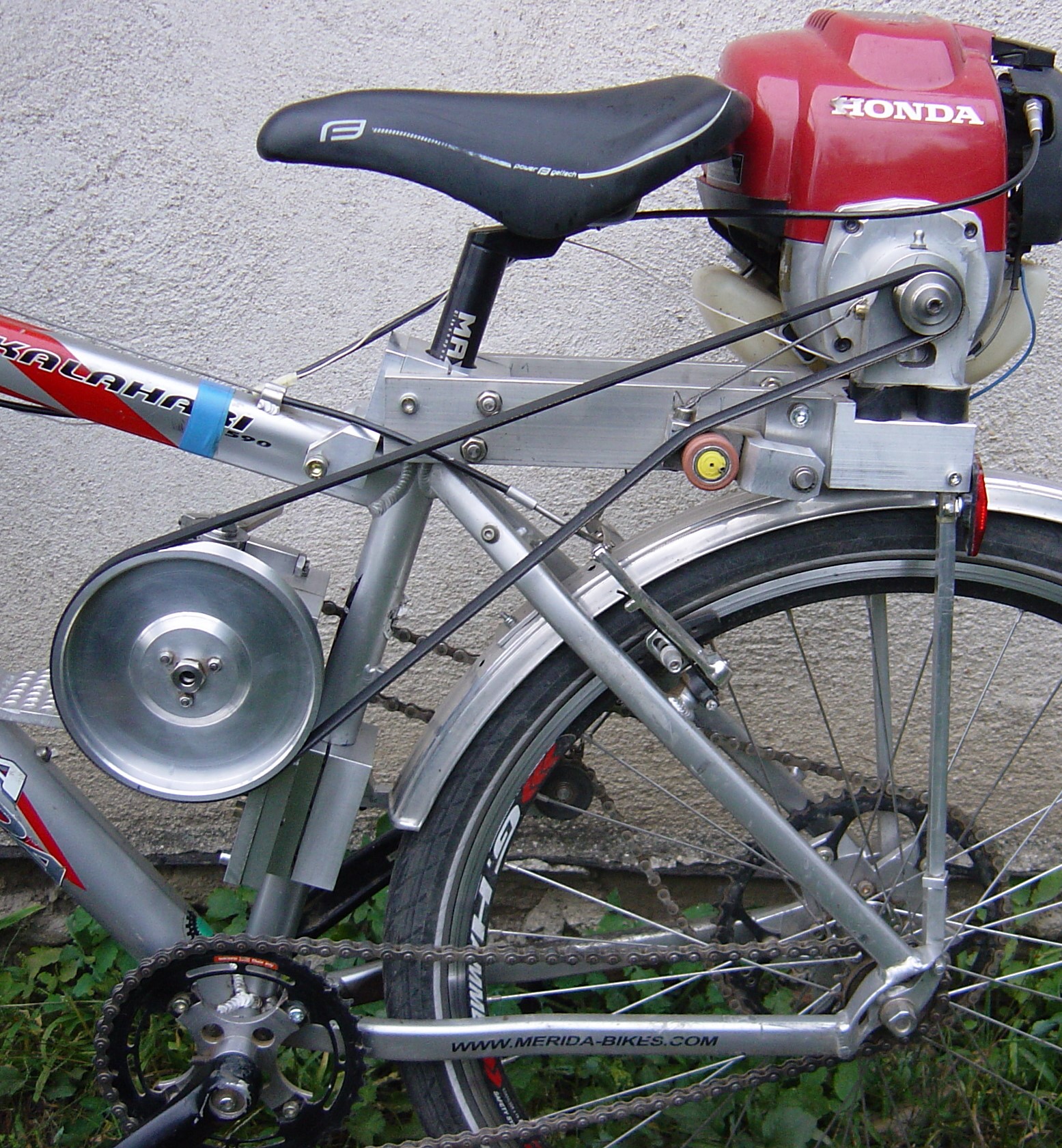 Já jsem to vyřešil takto: třírychlostní převodovka vlastní konstrukce ozubené kola jsou z pionýra, pohon od motoru mikroklínovým řemenem, rozeta má volnoběžku a kolečko pro jízdu bez motoru taky. Na jedničku vyjedu každej kopec bez šlapání a na trojku to dá 45 km/h.