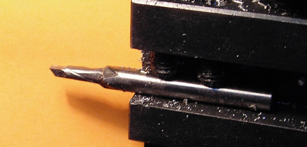 Zásobu nožů mám slušnou, ale hledaný nůž prostě nebyl - všechno bylo někam zahnutý a najíždět do to ho X krát upichovákem který se uhýbá kam může, se mi nechtělo. Trh si žádal výrobek ted a hned,takže jsem vazl 5 ku frézu, pomodlil se k Bohu ostření a šel jsem na věc. Z celé frézy jsem zbrousil z ostří až na válec a pak podle nějaké intuice tomu udělal podroušení z boků a z čela nevím kolik stupňů. Strčil do toolpostu, a ono to fungovalo DOKONALE! Nevím jak se mi to povedlo, žádný nůž s plátky mi takto nebere, ale prostě to funguje