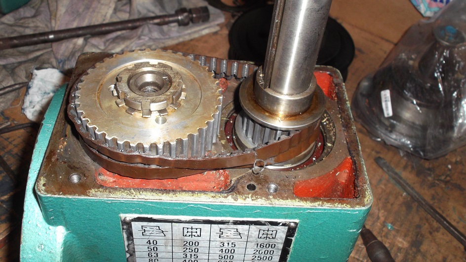 docital som sa v tomto vlakne, ze remenove prevody sa nedelaji bez napinaku. Aby som prispel do mlyna, prikladam aj ja jednu skusenost. Remenovy prevod som nasiel vo vysokootackovej hlave na frezku. Zacala sa mi freza zastavovat az sa uplne zastavila. Vreteno islo rukou potocit, ja som myslel, ze ozubenie na prevode bude ,,prec,, . Po demontazi to vyzera asi takto ako na foto.