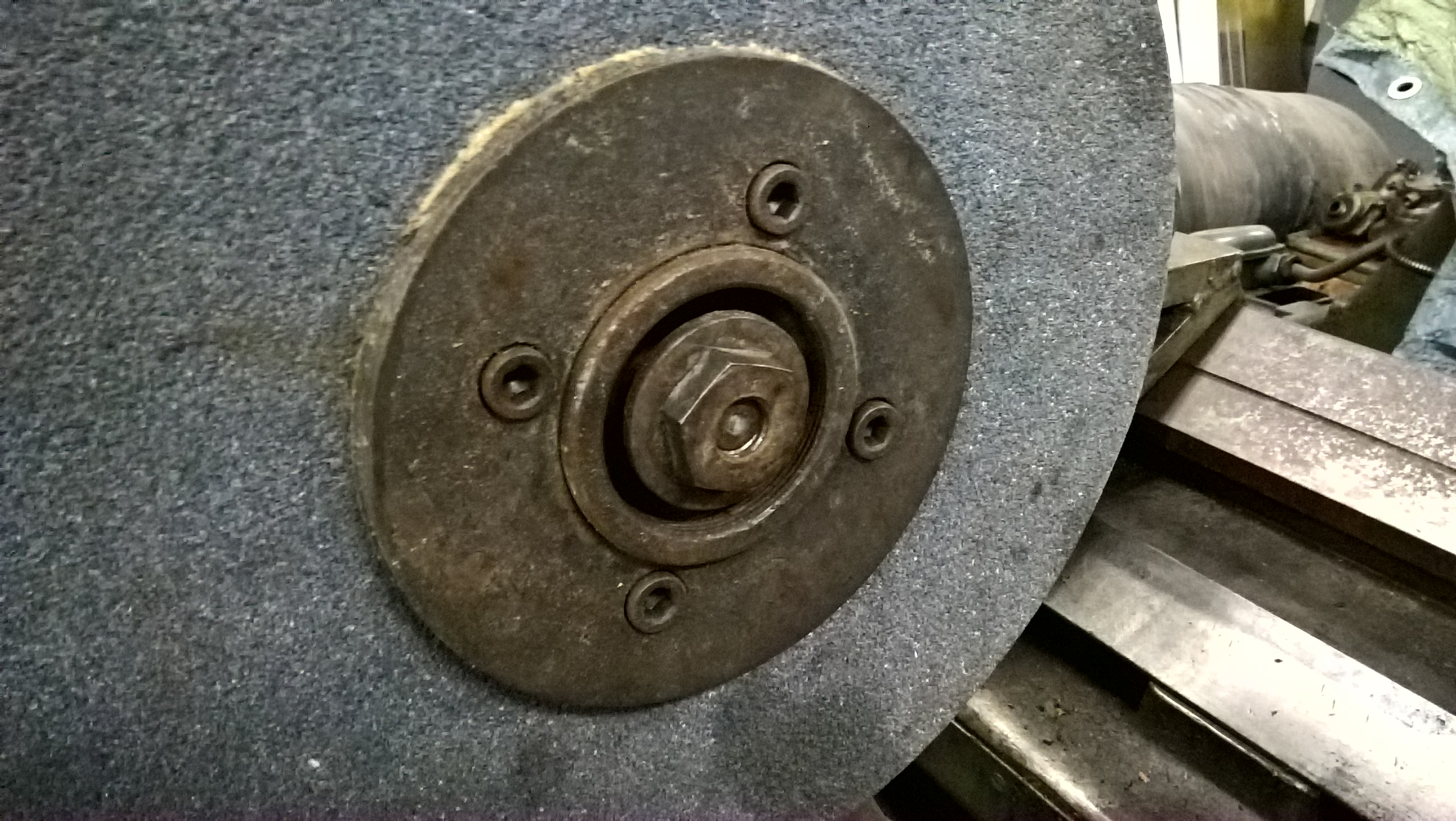 Já jsem mezitím chtěl alespoň sundat kotouč z magnetky ABAwerk co jsem v listopadu koupil. Kotouč je 200x25 díra nejspíše 51. Situace je podobná, ale místo 4 imbusů drží přední část příruby velký kroužek s vnitřním závitem našroubovaný na náboji příruby (na foto je to ten vnitřní závit úplně nejvíce venku) se 4 otvory pro klíč s kolíky. Vlastní příruba je držená levotočivým šroubem (mam dojem, že M20, ale zatím jsem to neměřil, protože to teď není důležité) co se taky povoluje klíčem s kolíky. Šroub se zašroubovává do otvoru ve vřetenu (na foto ten dlouhý vnitřní závit nejvíce uvnitř). Vytlačení příruby se dělá obdobně jako u hrotové brusky. Je tu na to v náboji vnitřní závit (na foto ten prostřední).