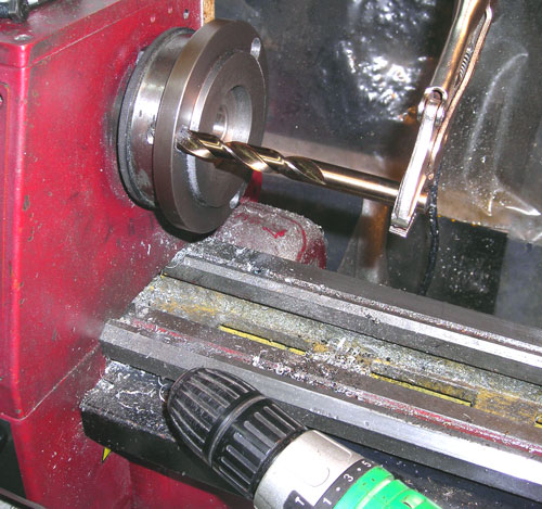 tak hotovo - ze všech rad jsem si vybral postup: srovnat házovost na hodinkách, srovnat čelo, navrtat navrtávákem, navrtat vrtálem 9,5, až do hloubkuy jaký dosáhne fréza - 20 mm, srovnat díru špičkou frézy vybočenou mimo osu v hlavičce umístěnej v toolpostu až do hloubky návrtu vrtákem 20 mm a pak zbytek 10 mm vrtákem durch do 80 mm. Zétra skočim pro materiál pr 35 mm a zkusim to na hrotech.