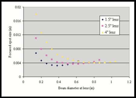 1- Sférická aberace. To je optická vada čočky. S rostoucím průměrem paprsku a klesající ohniskovou vzdáleností čočky se vliv sférické aberace zvětšuje. Třeba Synrad uvádí jako limitní poměr ohniskové vzdálenosti čočky vůči průměru paprsku vstupujícího do čočky hodnotu 5. Pokud je tato hodnota menší, tak dochází k silnému zkreslení "zaostřeného" bodu.