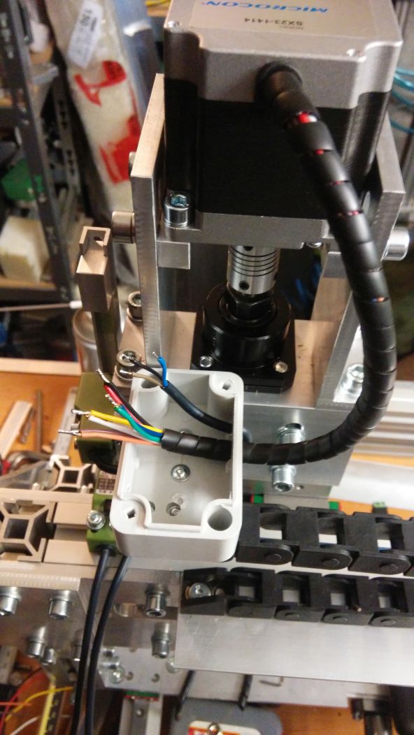 1) Pohybliva deska Z - privedeno 8 vodicu na dva ctyrpinove konektory. 4x silnejsi (2x napajeni vretena a 2x 12V stroje //treba laser/kamera/cokoliv) + 4x slabsi vodice (PWM rizeni a 3x rezerva).