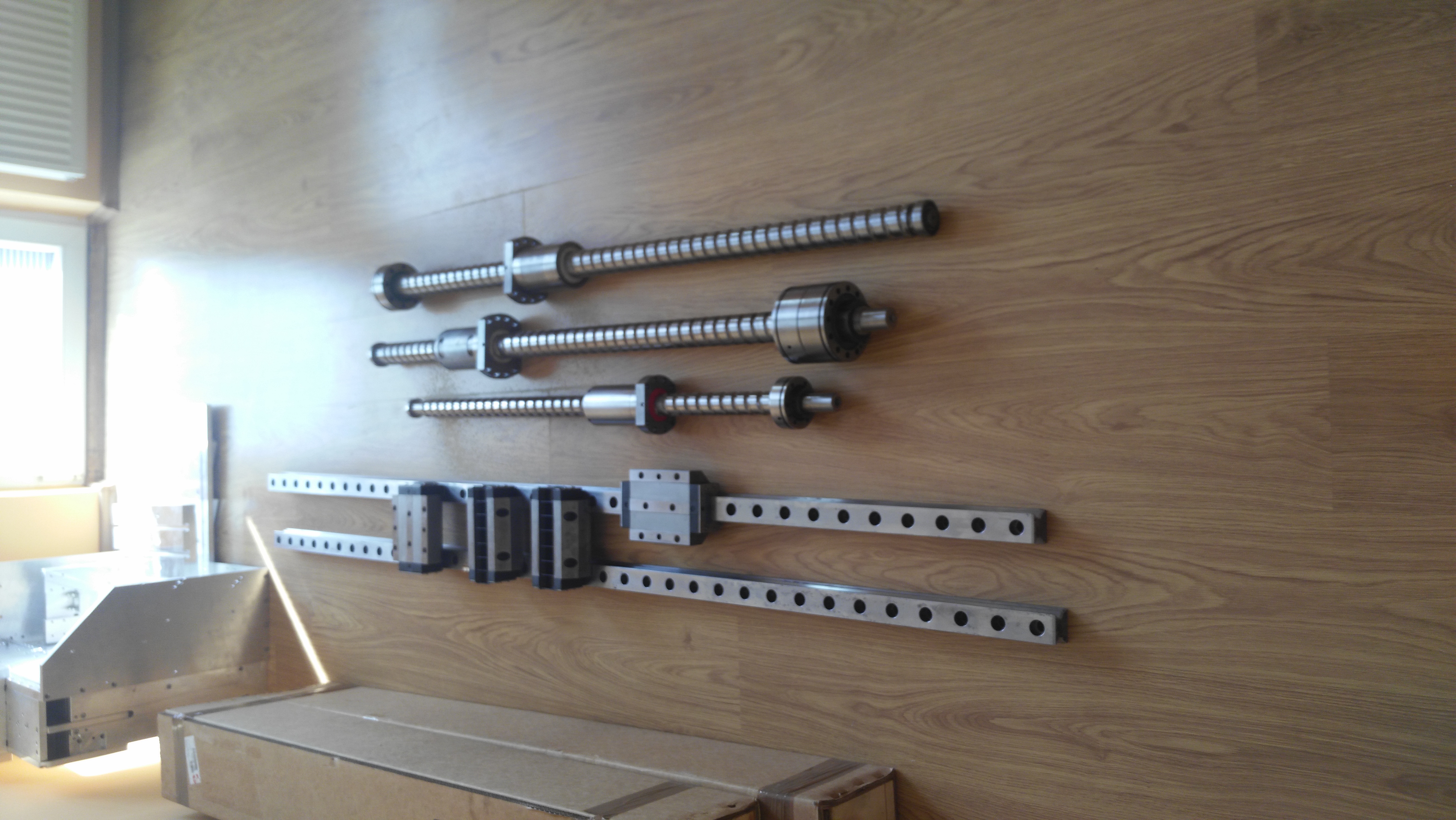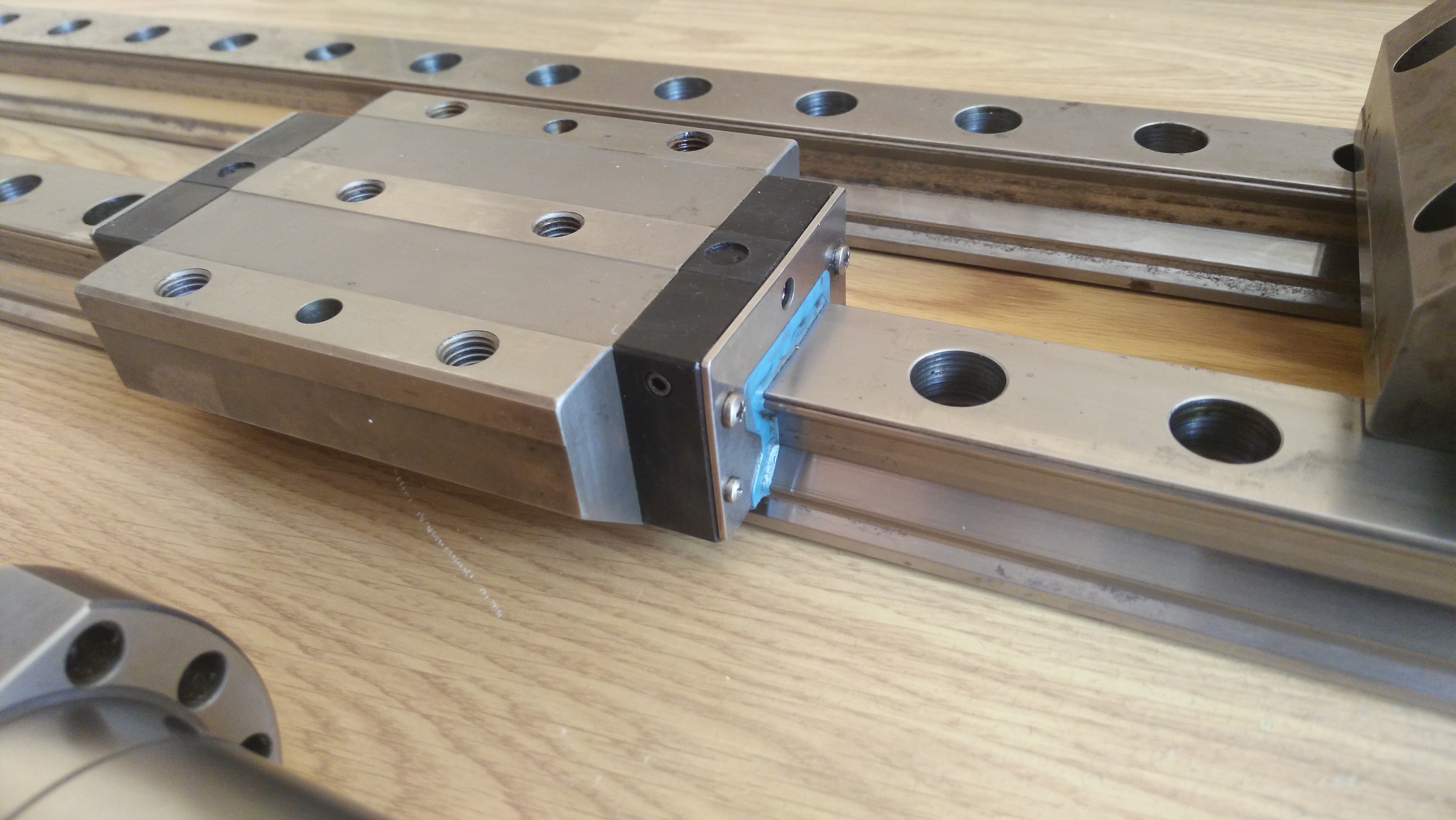 Jedná sa o 2 koľajnice a 4 vozíky. Jazdí to úplne tuho, žiadna vôľa, žiadne zadrhávanie. Dĺžka koľajníc 1940mm. Lineári boli ako Y na DMF250. Po asi 7 rokoch prevádzky boli vymenené spolu so skrutkou pre os Y aj Z. Po tých rokoch to malo za sebou pár nárazy, hádzali na pojazde 900mm cca 12mm. Ale ako som predpokladal, bolo to len v uchytení lineárov, samotne lineári som premeriaval a sú rovné. (video, drážka má 45,02 a lineár 45 +- pár tisícin, takže tých +-0,01mm sa môže odrátať)