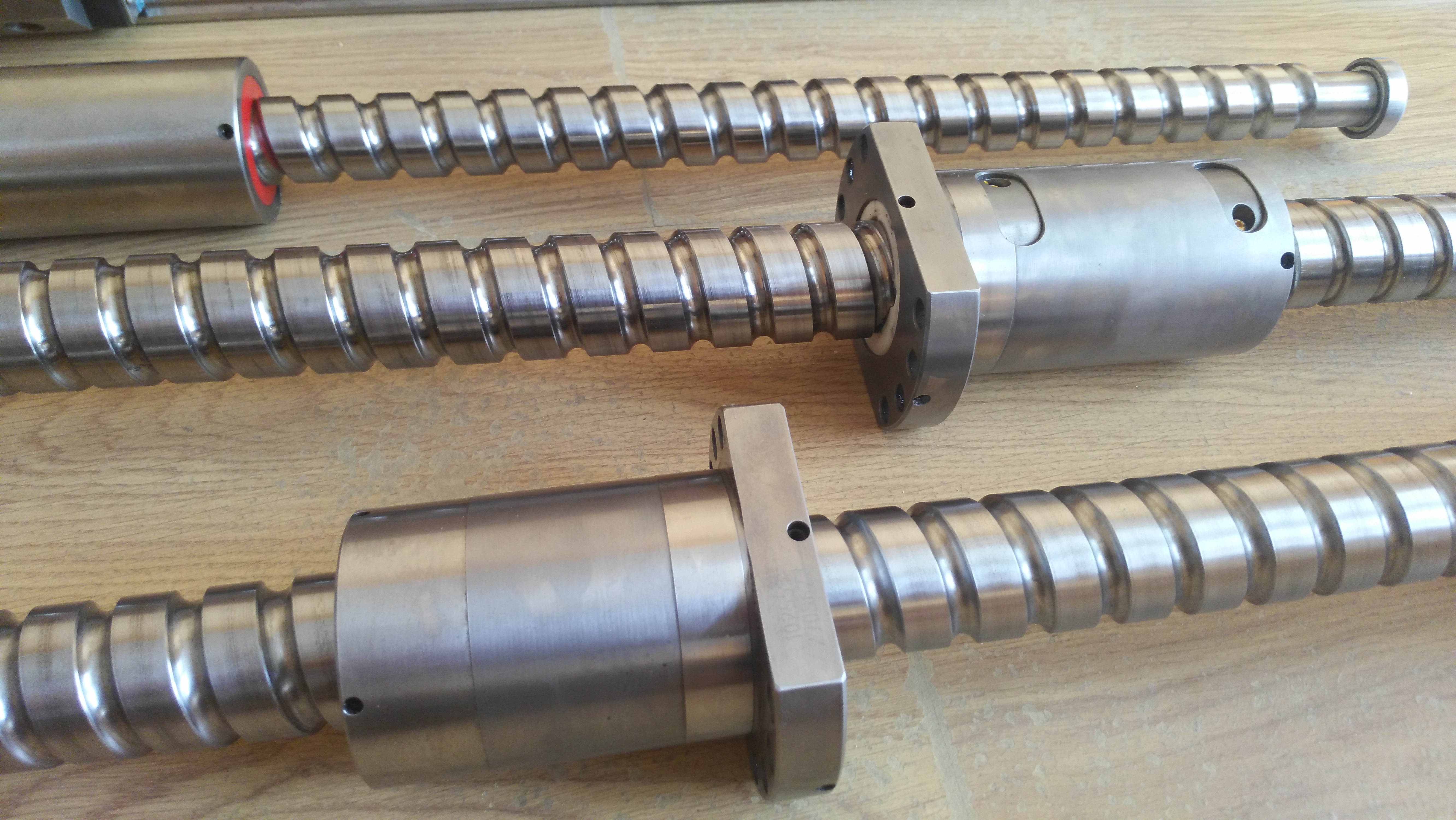 Ďalej tu mám už spomínané guličkové skrutky z Y a Z spolu s ložiskami. Jedná sa o skrutky KGT 50x25. (Y= KGT 50x25 R 1160x85x135 F L, Z= KGT 50x25 R 1055x85x160 F L) Y nemá absolútne nič, Z už pri práci na max rýchlo posuv (60m/min) bolo trocha počuť. Ale inak sú úplne v poriadku. Aj ložiská. Servisáci to menili minulí rok po tom, čo nám laser počas merania trošku zblbol a nezaznamenal nástroj. Tak sa to celé hodilo na poisťovňu.