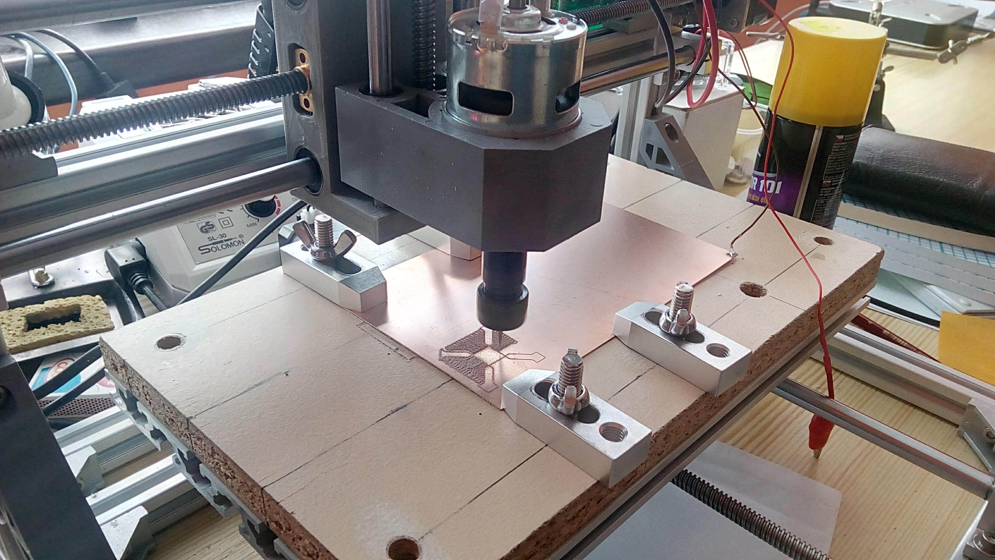Tahle frézka není z aukra. Je přímo z Číny za 8k. Co se týče vřetena tak jsem si žádné házivosti nevšiml. Podařilo se mi s tím vyfrézovat DPS pro mikroprocesor s pouzdrem TQFP64 s roztečí 0.5mm. Ohledně upnutí cuprexitu děkuji za rady. Oboustrannou lepící pásku používám ale po chvíli se odlepí. Ty upínáky zkusím utahovat méně. Vždycky jsem je dotahoval až na doraz.