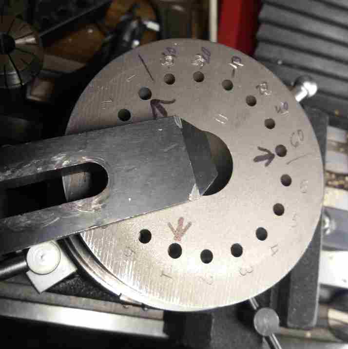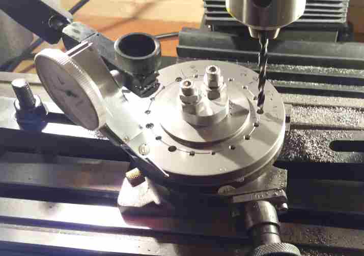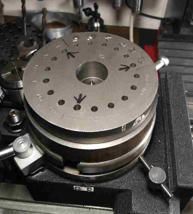 Měření osazení přípravku Dokončení přípravku Pak bylo nutné připravit vrtací otvory jako šablonu - bohužel jsem neuměl přesně odměřit tak jsem přípravek umístil na děličku vycentroval na 0,01 mm a vrtal po 0,2 poloměru po 20° viz obrázek.