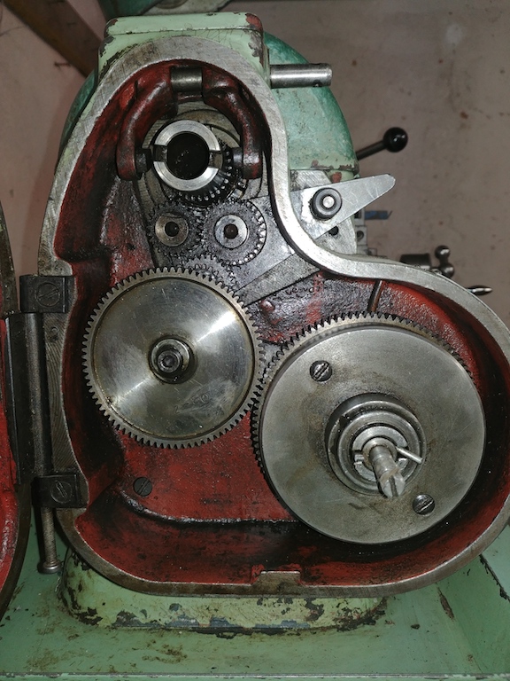 Na soustruhu vypadaji krive osy kolecek, ktere pripojuji soukoli posuvu na hlavni hridel. Spinac na reduktoru nahrazen nejakym kolickem (vypada to, ze byl strizen "prstynek", ktery to prevadel na hnaci sroub - radsi si ani nepredstavuji co se muselo stat aby k tomu doslo :shock: ). Vkladam foto jak jsem tento tyden blesknul, nez jsem to rozebral. Sroub na prevodovych kolech pres bronzovou spojku take neni orig. a vice me znerzovnuje ta matka pod nim. Proste spousta prace (na kterou se ale tesim :D ).