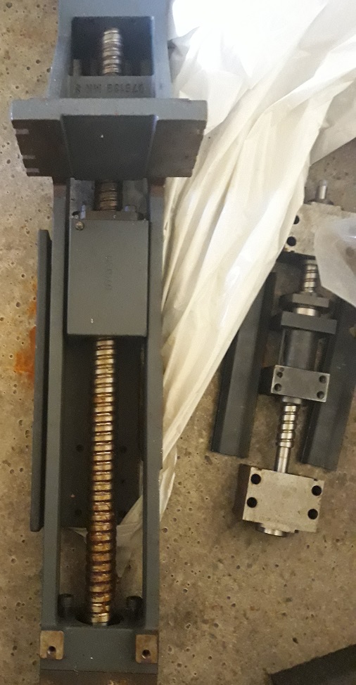 kuličkový šroub v kazetě i s ložisky, vše smontované, jen připojit motor. Stoupání 10mm, celková délka kolem 1m, a asi 20mm průměr. Pojezd asi 50cm.