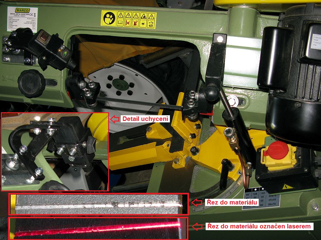 ten můj laser je lehce stavitelný = drbnutím jde rozhodit. Že svítí na pás vidím, ale že je výškově kolmý poznám podle rysky, kterou jsem udělal dole na tyčce délkového dorazu. Pro rychlou kontrolu je to dobré.