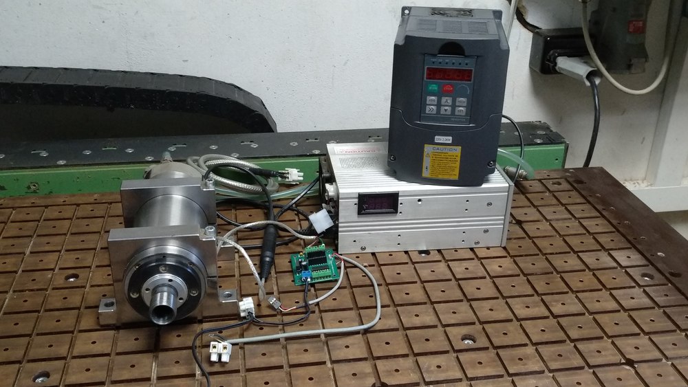 Sada obsahuje vřeteno s čidlem pro měření otáček (destička pro Mach), měnič, profesionální zesílené chlazení a velmi přesné držáky (koupené zde na fóru). Hned po koupi vřetena jsem koupil lepší ložiska (3.000,-Kč) a nechal přebrousit kužel vřetena setinové hodinky se téměř nehnou (2.000,- Kč). Vše nastavené a funkční v Mach4 s ESS, oddělovacími deskami a PWM převodníkem z CNCshopu. Naběháno cca 100 hodin.