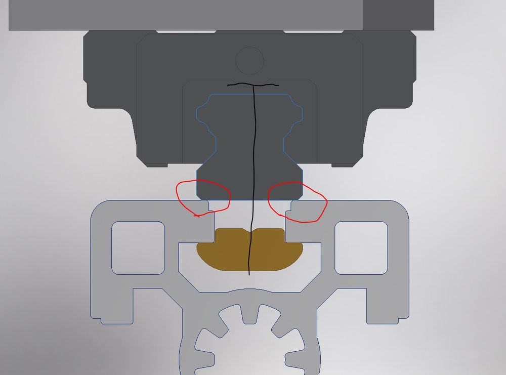 Ten profil je 90×45 mm - těžká řada, takže není subtilní jak se tady někdo domníval. Na jeho delší hraně je drážka (cca 1mm hluboká), tak co ji přefrézovat a kolejnici dorazit na její spodní hranu? Váha celého vršku stroje by tak přes vozíky neustále dorážela kolejnici na tu hranu v profilu a nemohlo by se to pohnout..