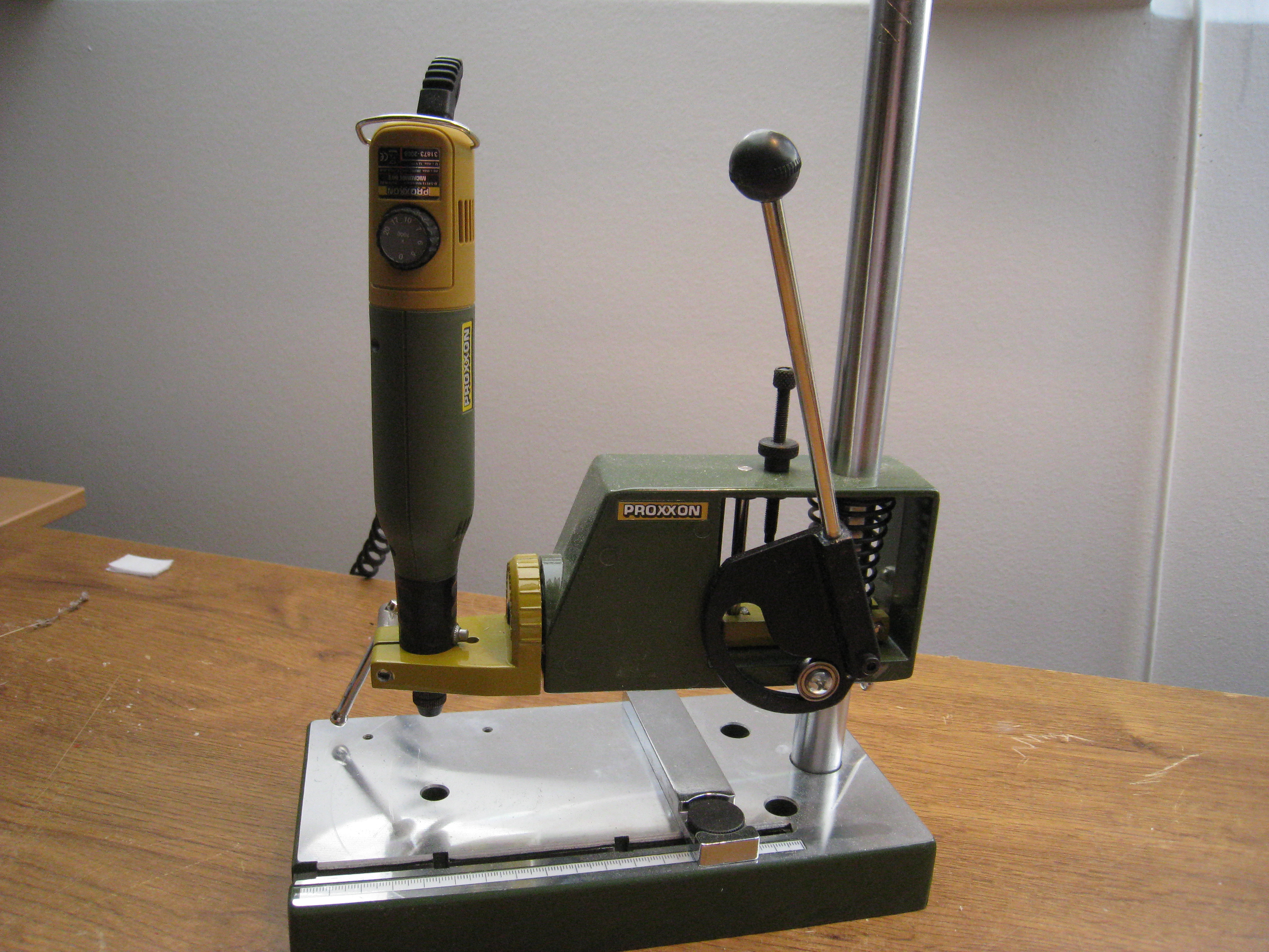 Je otázka co si od toho slibuješ, řekl bych že desítku překližku s tím proxonem nedáš. Co se týče té vrtačky, jak se chová teď hlučí? drnčí? vřeteno s hlavičkou běhá? Jaké jsou tvé možnosti strojního obrábění? Protože pokud máš jen stojanovou vrtačku a svěrák tak ani z jednoho nejspíš nějaké úchvatné obráběcí centrum neuděláš.