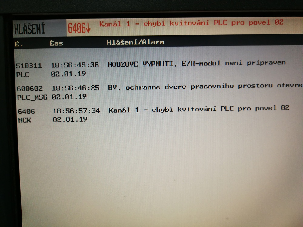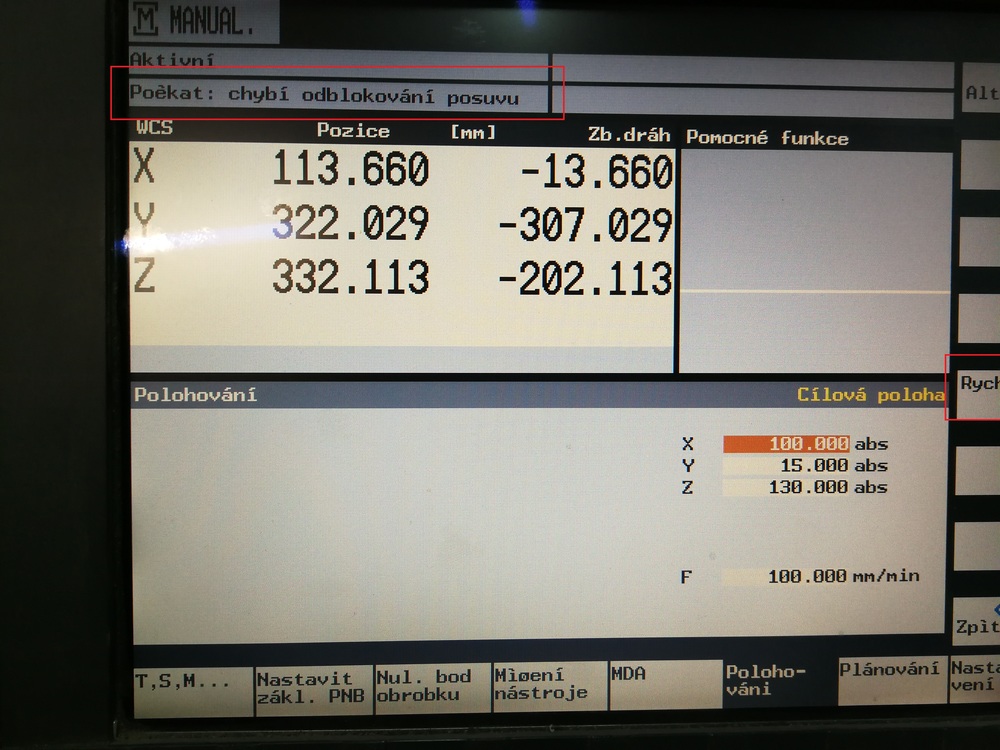 Prí výmene nástroja sa mi v polovoci výmeny masina zastavila a napísalo chybu niečo so spatným zoznamom nástrojov presne si ju nepametam. Masina nesla pohnúť ,bola zaseknutá vo výmene. spravil som následovné, stlačil som cetral stop, nanovo nahodil motory, odisiel rucne v osi X z vretenom mimo zásobníku, zatvoril som dvere zásobníku fukciou m17. Ked som znova chcel poslat nástroj do výmeny po stlačení ,,CYCLE START,, stroj čáka je v auto režime výmeny ale nič sa nedeje. da sa to zrušiť iba cez ,, CENTRAL STOP,, následne nahodiť motory a v tom vypíše chybu: ,,6406 chybní kvitováni PLC pro povel 02,, , chyba sa nedá zrušiť uz nefungujú ani ručne posuvy. Tento stav sa dá odstránit iba tvrdym vypnutim a znovu zapnutim stroja. Další problem je ten ze, ked chcem vymeniť nastroj ručne do vretena tak po vyvolaní ,,T0,, aby vreteno prislo ku mne a mohol som odopnut nástroj, stroj iba čaká a píše hore v riadku: ,,chybí odblokovaní posuvu,, . Tak isto v ručnom rýchlom polohovaní viď foto stroj píše tú istú chybu : ,,chybí odblokovaní posuvu,, ale ked to dám napolohovať rychloposuvom tak to ide.