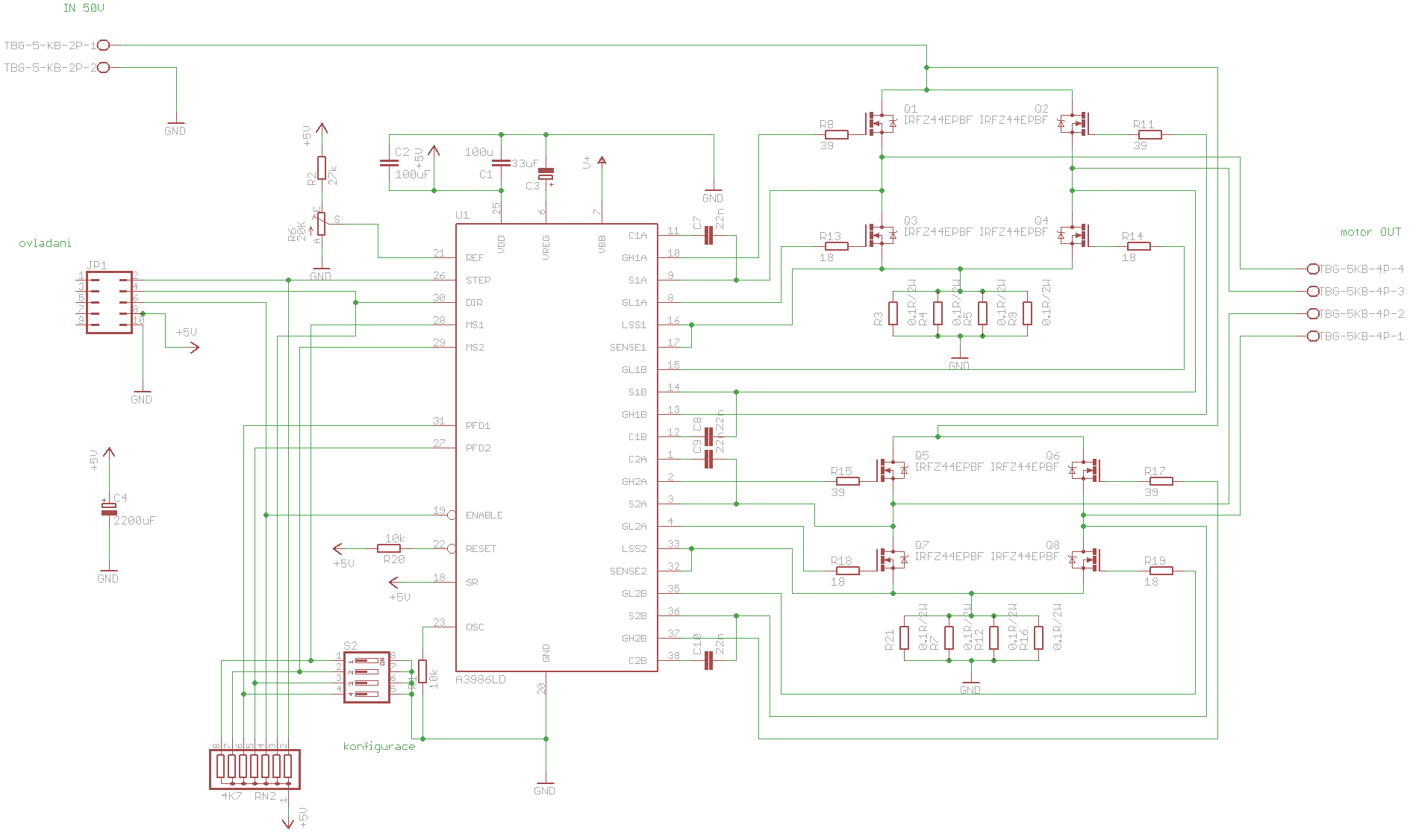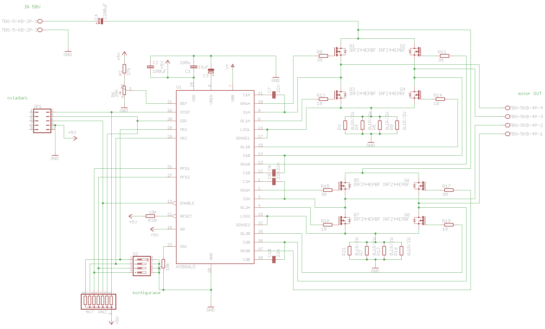 . Akorát nepotřebuješ signál STEP mít přes odpor na VCC (pravděpodobně udělá jeden krok už při zapnutí), spíš bych ho dal na zem a kndenzátor C4 nemá být na VCC ale na napájení motoru 50V. Na silových částech si dej záležet. Toto zapojení bude fungovat. Možná bych ještě doplnil vstupy SENSE o RC člen aby to trochu filtrovalo ty nejostřejší špičky (já tam mám 1K na sense a 33pF na GND), ale není to nutné, zdá se že obvod to zvládá i tak.