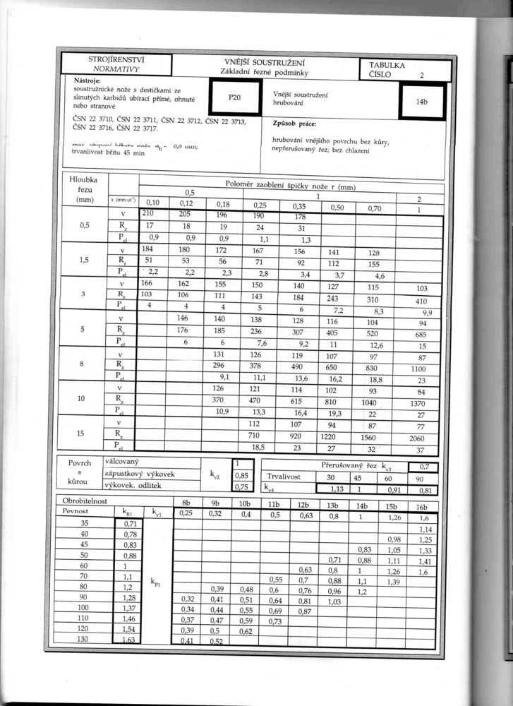 Třeba: pro výkon motoru 6kw je hloubka řezu (h) 5mm, řezná rychlost (v) 140m/min, posuv (s) 0,18 mm/ot., zaoblení špičky nože (r) 0,5 mm.