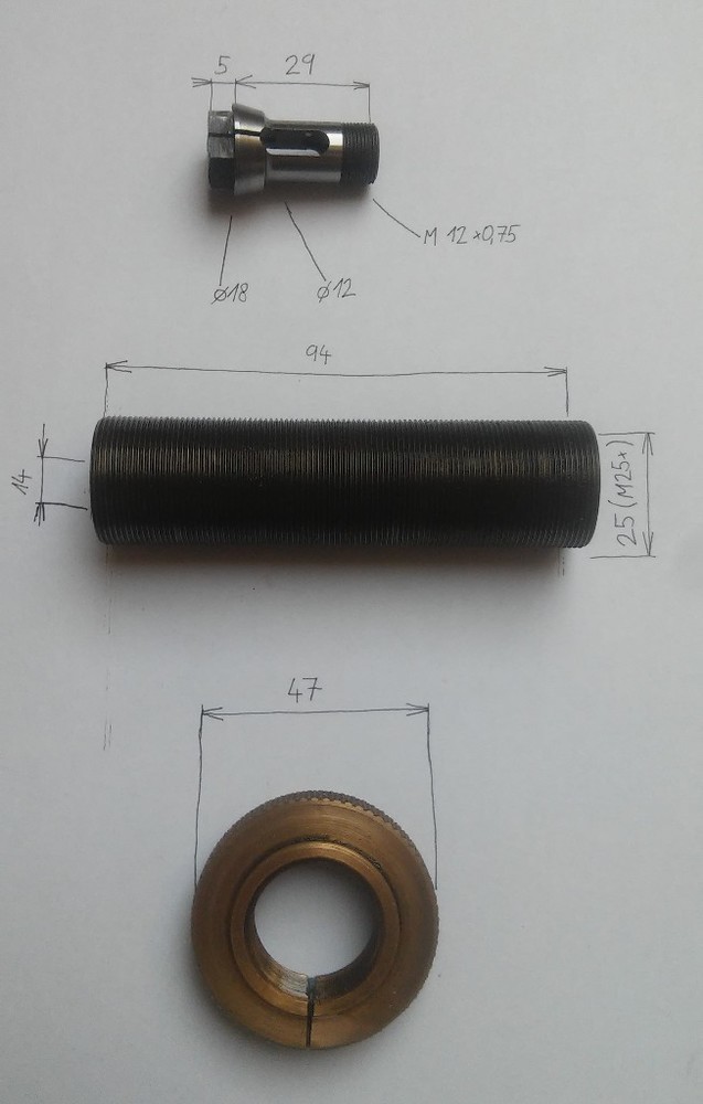 Po chvilkách pokračuji s závitořezem. Okótoval jsem nějaké díly co bych potřeboval. I když naděje není veliká. Dokázal by prosím někdo určit typ té kleštiny? Je to ze starší vícevřetenové hlavice Romai KR, ale u nich na webu jsem tento typ kleštin nenašel.