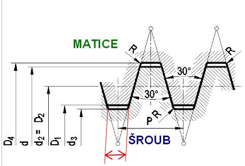 Hodnoty d3, d2, D4, D2 jsou vyhledány ze strojnických tabulek pro jmenovitý průměr lichoběžníkového(trapézového) závitu a dané stroupání.