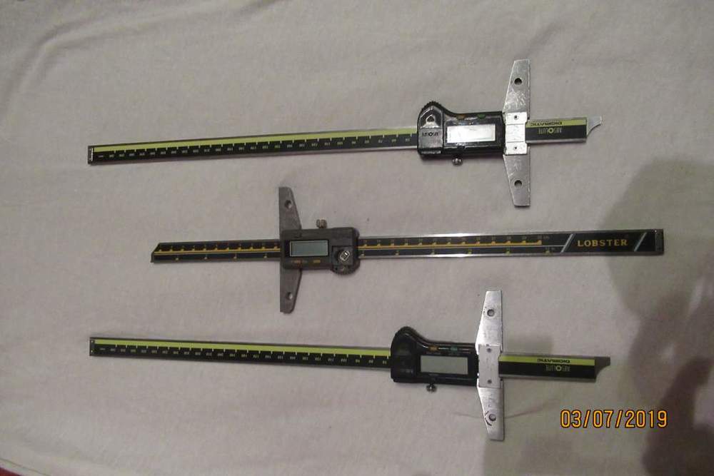 Hloubkoměry 300mm jednak Mitutoyo Absolute Digimatic a nebo Lobster (od každého mám dva kusy). Mitutoyo 600Kč/kus, Lobster 500Kč/kus (těm chybí dvířka baterie - můžu zase natisknout).